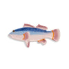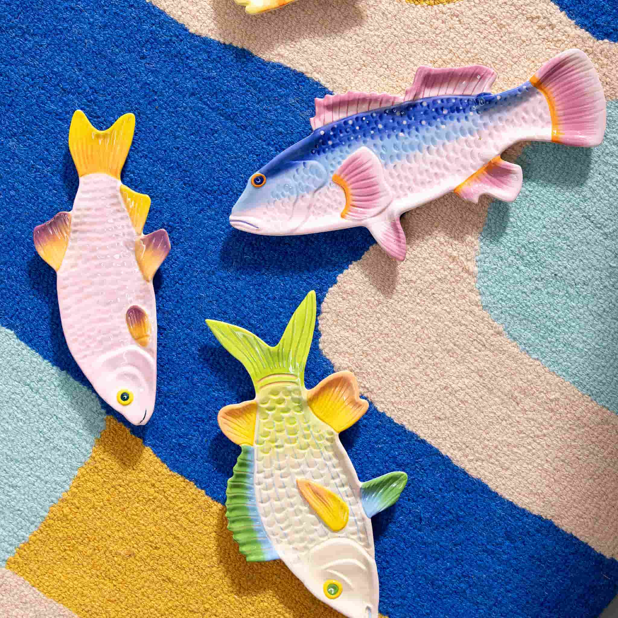 The fish-shaped plate has realistic fin and scale detail. It is hand-painted in vibrant shades of blue, pink and orange.