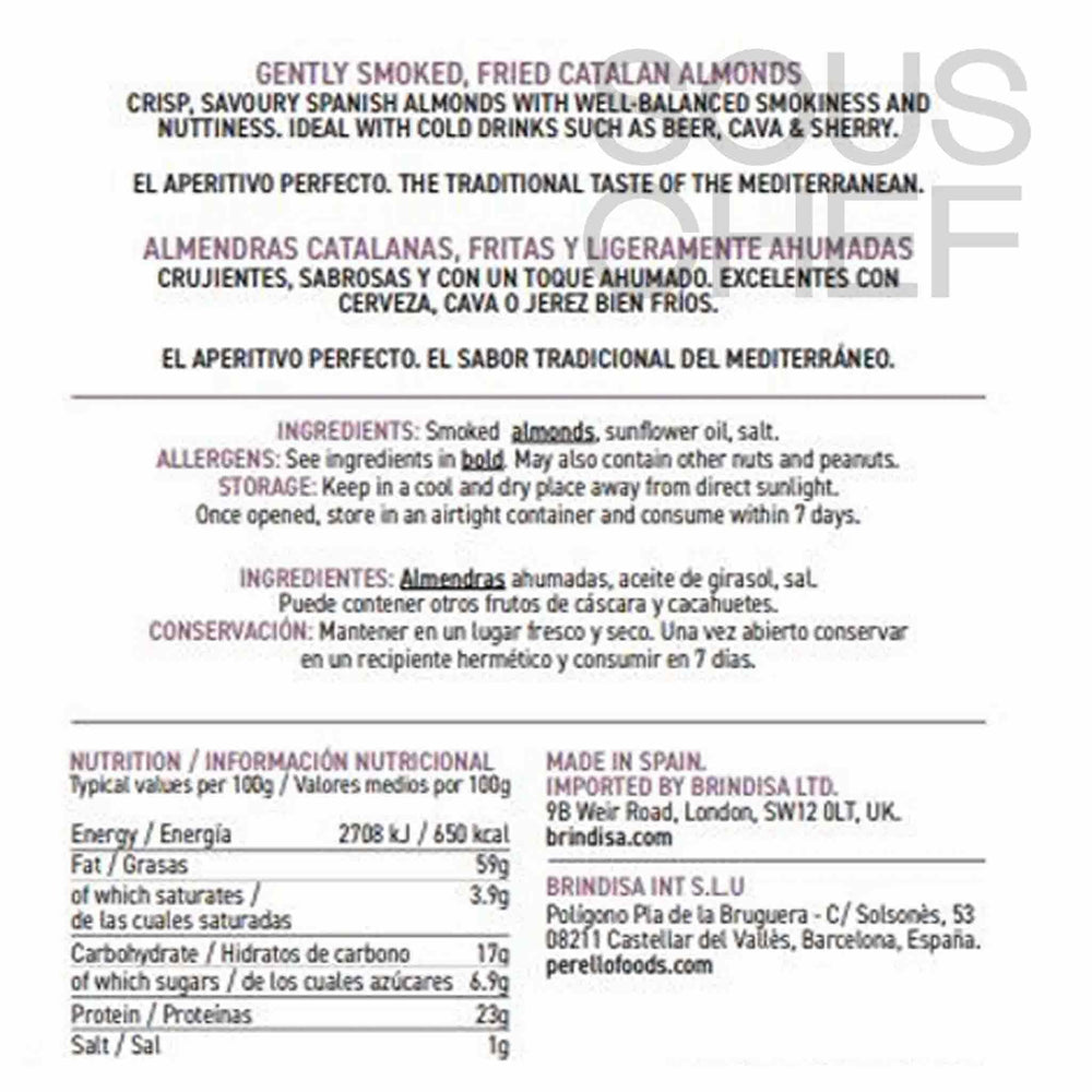 Product formulations and details may change. For the latest ingredients and allergen information always check product packaging prior to consumption. Ingredients: smoked Catalan almonds (nuts), sunflower oil, salt.
