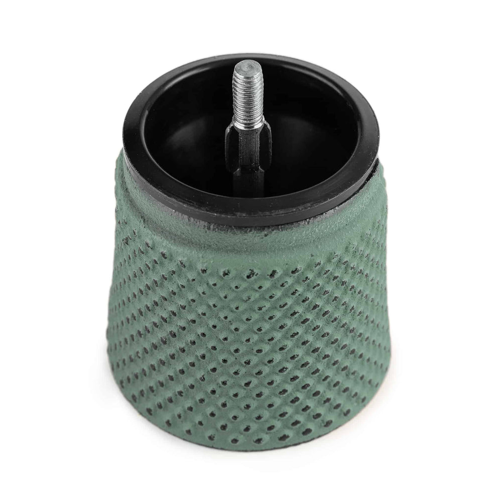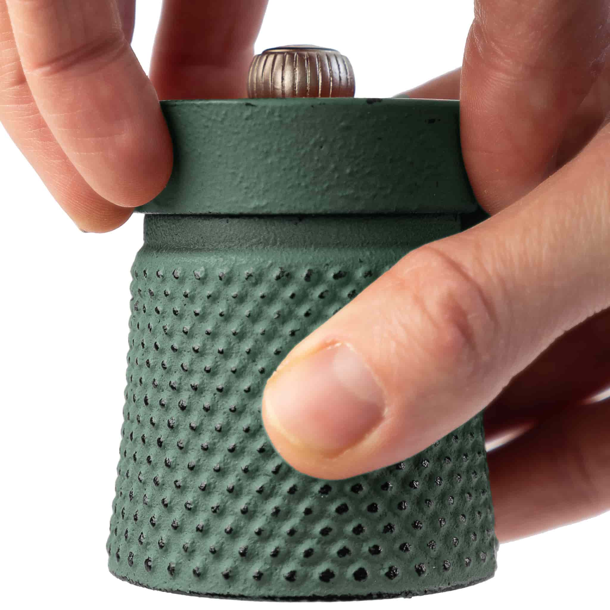 The dark green mill features a classic hobnail design. The raised dots give it a unique look and feel. Each mill has a grind adjustment button on top. The tighter it is, the finer your grind will be.