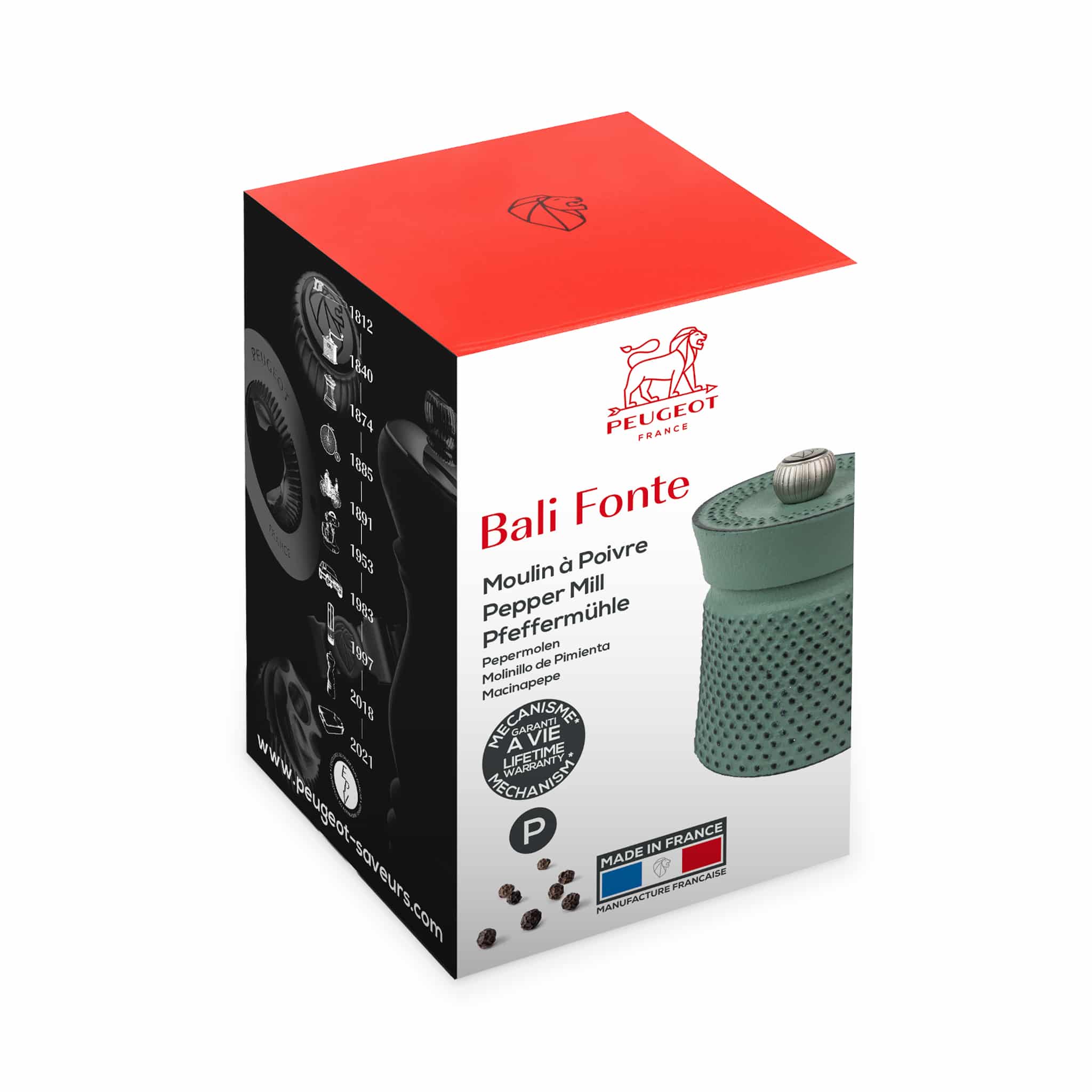 Fill the Peugeot Bali Fonte green mill with black, pink or Sichuan peppercorns. The heavy cast iron mill is ideal for seasoning in the kitchen or at your table.