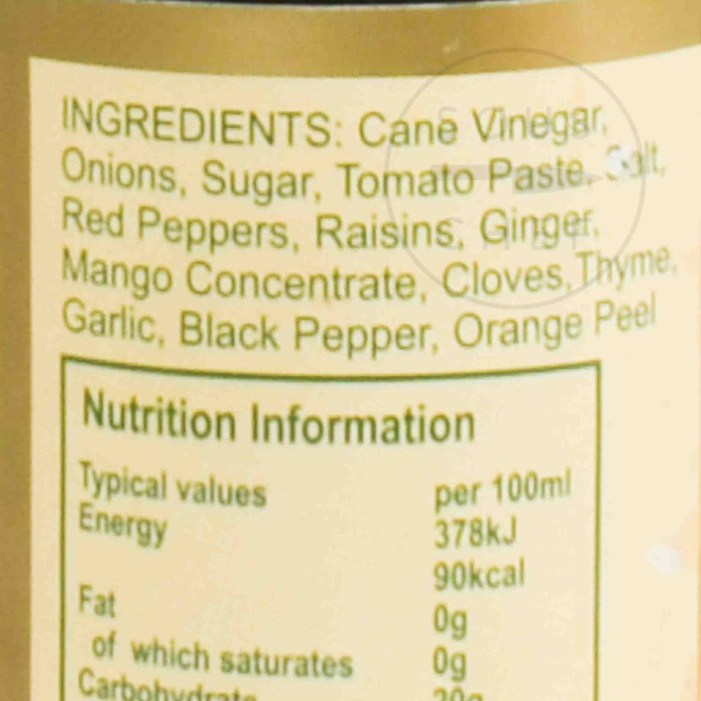 Product formulations and details may change. For the latest ingredients and allergen information always check product packaging prior to consumption. Ingredients: Cane vinegar, onions, sugar, tomato paste, salt, red peppers, raisins, ginger, mango concentrate, cloves, thyme, garlic black pepper and orange peel.