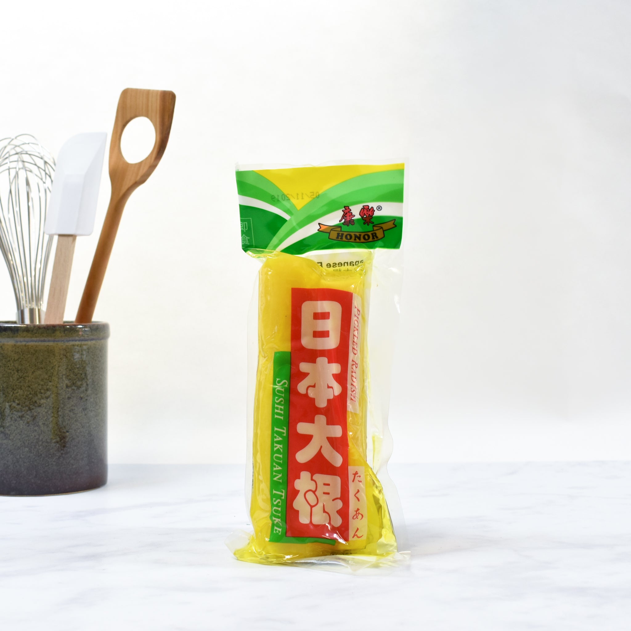 Wash and slice thinly before serving. Enjoy the pickled daikon as a side dish with other tseukemono - Japanese pickles - and steamed japanese rice, or cut into slivers and use to decorate bento boxes, or in sushi. It is most commonly seen by itself in maki rolls as shinkomaki, or along with fatty tuna as torotaku-maki, or hand rolls.