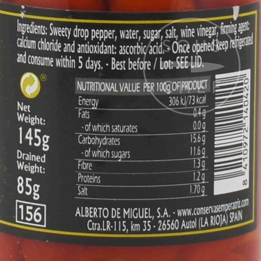 Product formulations and details may change. For the latest ingredients and allergen information always check product packaging prior to consumption. Ingredients: Teardrop pepper, water, sugar, salt, wine vinegar, hardener: calcium chloride and antioxidant: ascorbic acid.