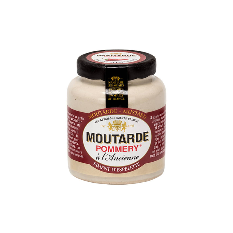 Pommery Espelette pepper mustard is a nutty wholegrain mustard with the distinctive hot flavour of Espelette pepper. Serve with any grilled meat at the table, or use to coat steaks or chicken breasts just before cooking.
