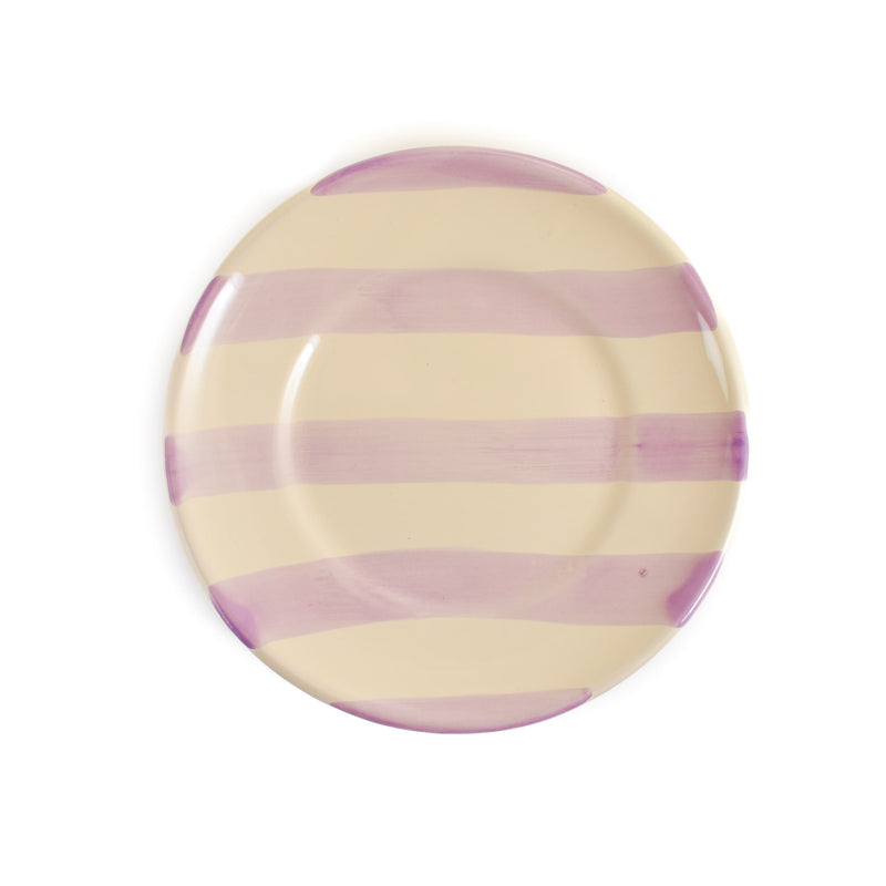 Made in Italy, the plate features lilac stripes on an off-white background. Each one is hand-painted so no two are the same.