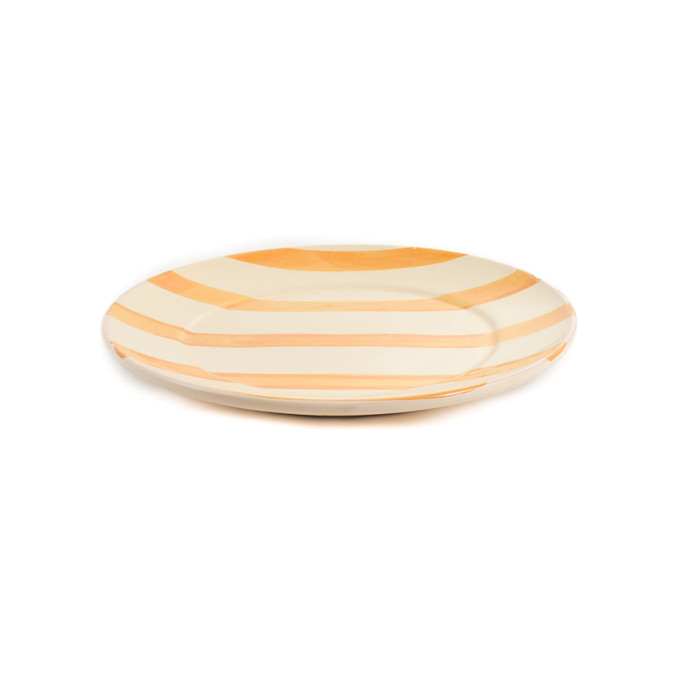 This dinner plate is made in Italy from durable ceramic. Each plate features hand-painted yellow stripes.