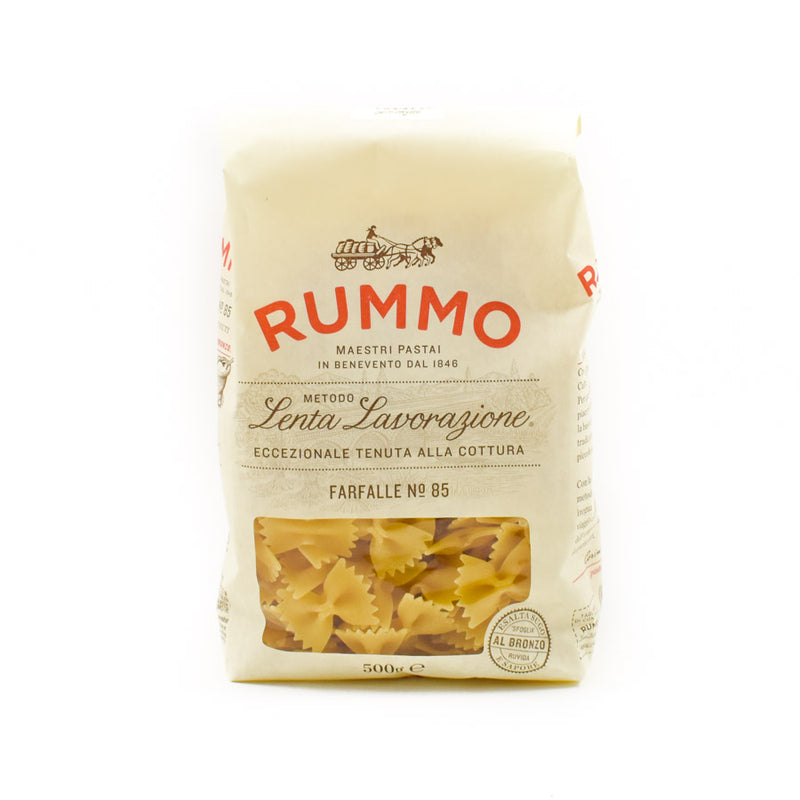 Rummo farfalle no. 85 pasta is the classic butterfly or bow-tie shaped pasta. The small, flat pasta shapes are ideal for holding cheesy and rich tomato sauces. Rummo farfalle cooks in 12 minutes.