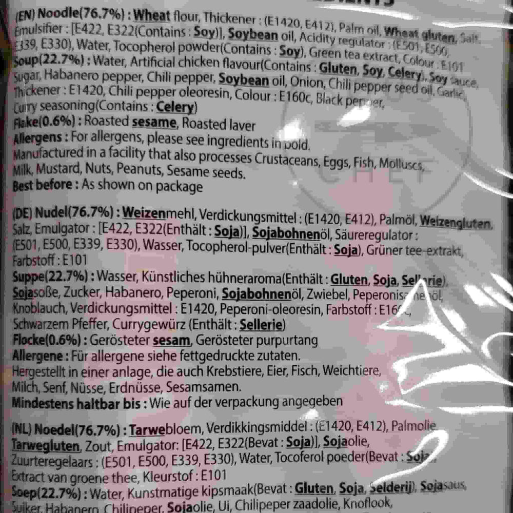 Product formulations and details may change. For the latest ingredients and allergen information always check product packaging prior to consumption. Ingredients: Noodles (76.7%): wheat flour, thickener (E1420, E412), palm oil, wheat gluten, salt, emulsifier (E422, soy lecithin (E322)), acidity regulator (potassium carbonate (E501), sodium carbonate (E500), sodium phosphate dibasic (E339), citric acid (E330)), water, tocopherol powder (contains soy), green tea extract, colour E101. Soup (22.7%): water, artificial chicken flavour (Contains: gluten, soy, celery), soy sauce, sugar, habanero pepper, chilli pepper, soybean oil, onion, chilli pepper seed oil, garlic, thickener: E1420, chilli pepper oleoresin, colour E160c, black pepper, curry seasoning (contains celery). Flake (0.6%): roasted sesame, roasted laver.