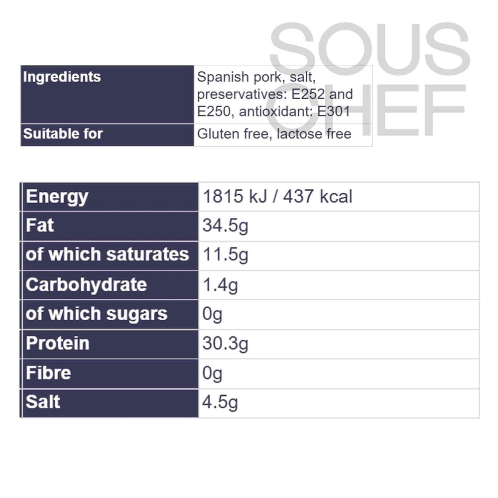 Product formulations and details may change. For the latest ingredients and allergen information always check product packaging prior to consumption. Ingredients: Spanish pork, salt, preservatives: e252 and e250, antioxidant: e301