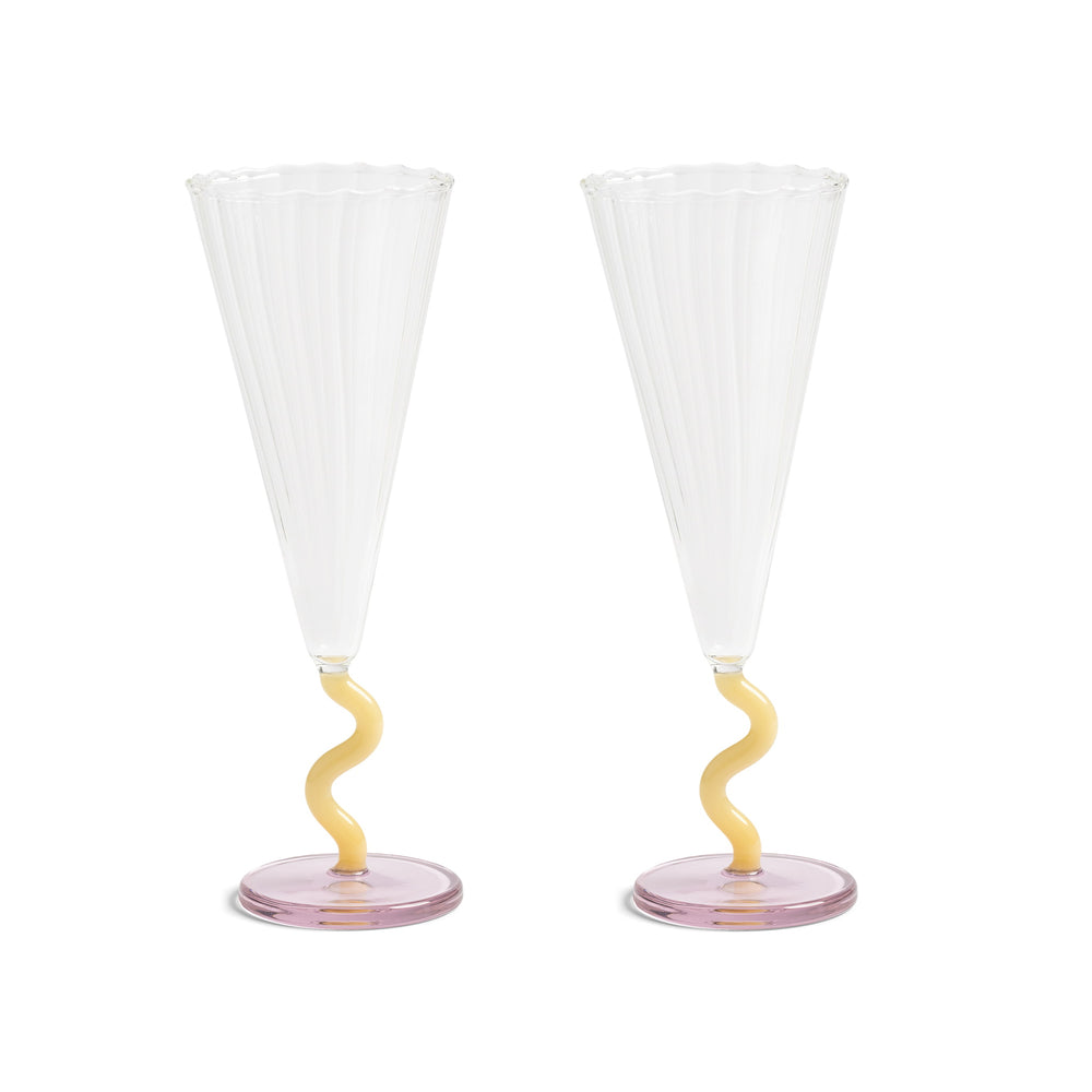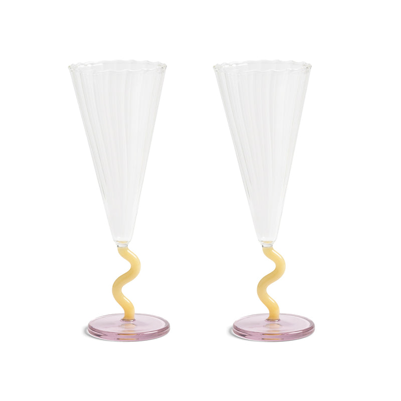 Each flute has a pink base and wavy yellow stem. The bowl is transparent so you can admire the bubbles. Fill the flutes with chilled prosecco or vintage Champagne. They’re also ideal for cocktails like mimosas and Bellinis.