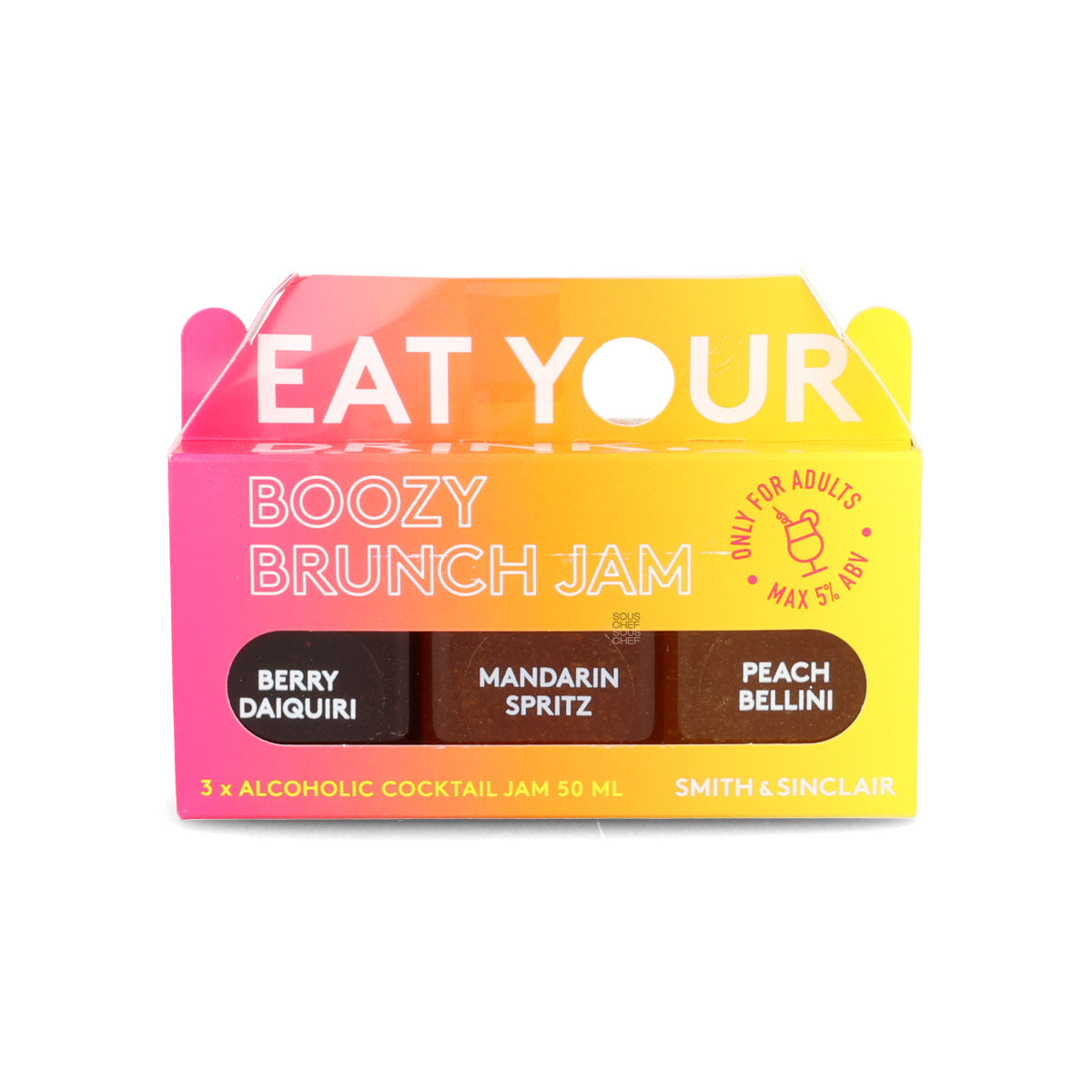Boozy brunch jams are inspired by three cocktails. Enjoy your favourite tipple in the form of a sweet, fruity preserve. They contain real alcohol, and are 5% ABV.