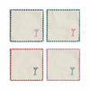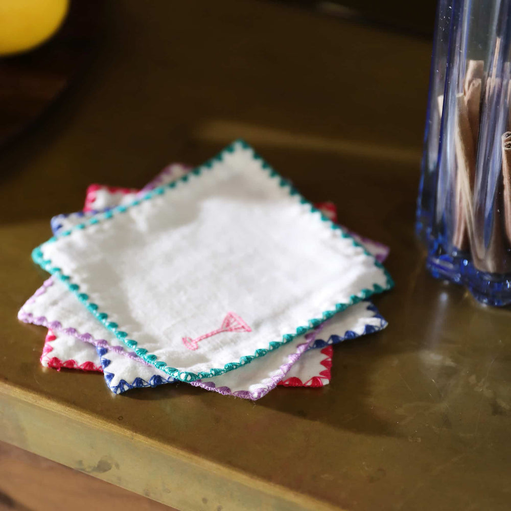 Serve drinks in style with this set of four cocktail napkins. They’re made from 100% cotton with an embroidered zigzag border. Each one is a different colour so guests can easily identify their own. Choose from blue, green, red or purple.