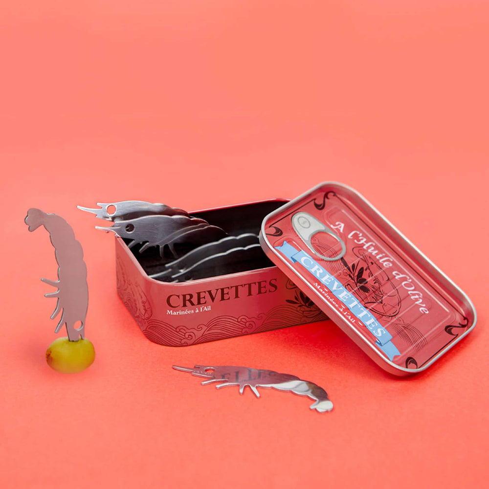 Use these prawn snacking forks to eat olives and seafood appetisers. The retro tin contains six shrimp-shaped forks. The pointed end is great for skewering prawns and calamari.