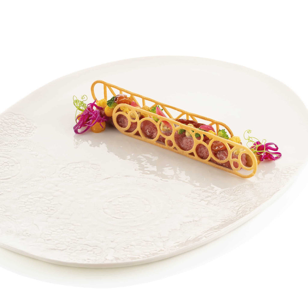This Silikomart food mould has a geometric circular design. Use it to create stunning sweet or savoury decorations to add a touch of fine dining flair to your dinner table. The flexible silicone mould can be used to bake bite-sized aperitif or add shape to a savoury mousse or terrine.