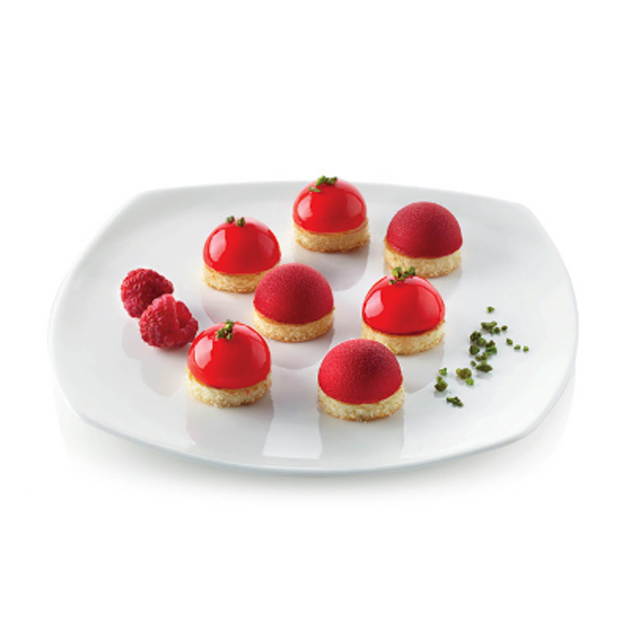 Use Silikomart’s silicone semi sphere mould to create miniature sponges, mousses and desserts. To use the flexible mould, pipe or pour in your batter or ice cream, then bake until golden or chill until set. Once ready, carefully pop the desserts from the mould to reveal a perfectly round surface. Enjoy the desserts as they are, or glaze the semi spheres with a fruit gel. Pour over melted chocolate or simply dust with cocoa powder for a beautiful finish.