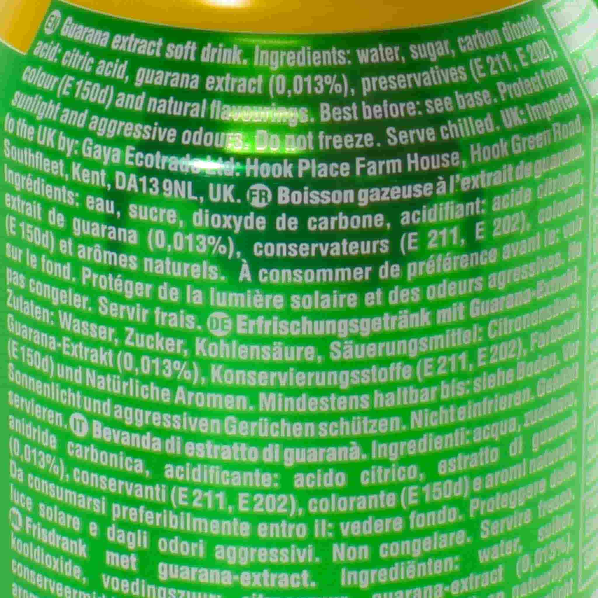Product formulations and details may change. For the latest ingredients and allergen information always check product packaging prior to consumption. Ingredients: Water, sugar, carbon dioxide, acid: citric acid, guaraná extract (0.013%), preservatives: (E211, E202), colour: caramel (E150d), natural flavourings.-