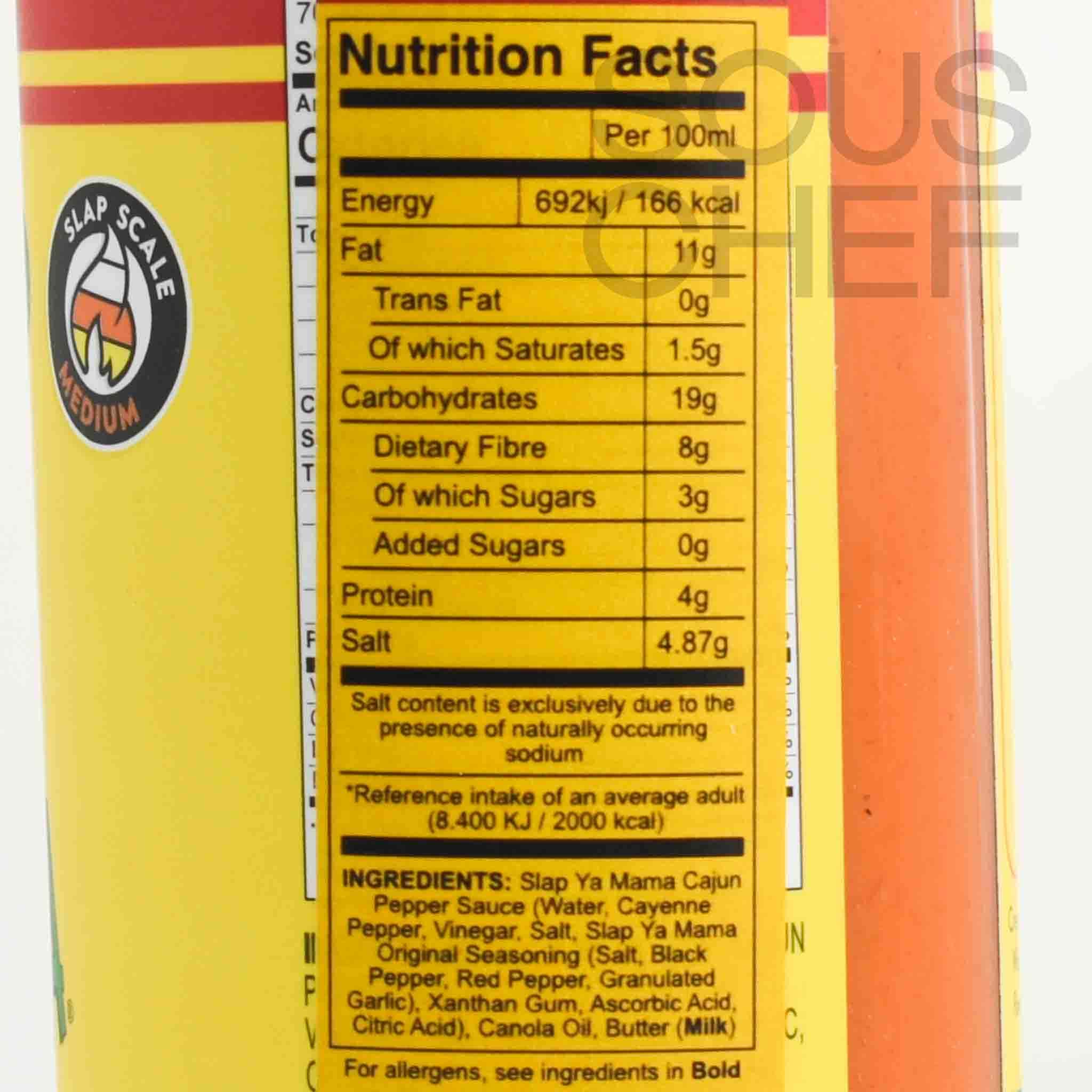 Product formulations and details may change. For the latest ingredients and allergen information always check product packaging prior to consumption. Ingredients: Slap ya mama cajun pepper sauce (aged pepper mash, vinegar, salt, xanthan gum, garlic, other spices) canola oil, butter, buds, ascorbic acid, citric acid, garlic juice, xanthan gum