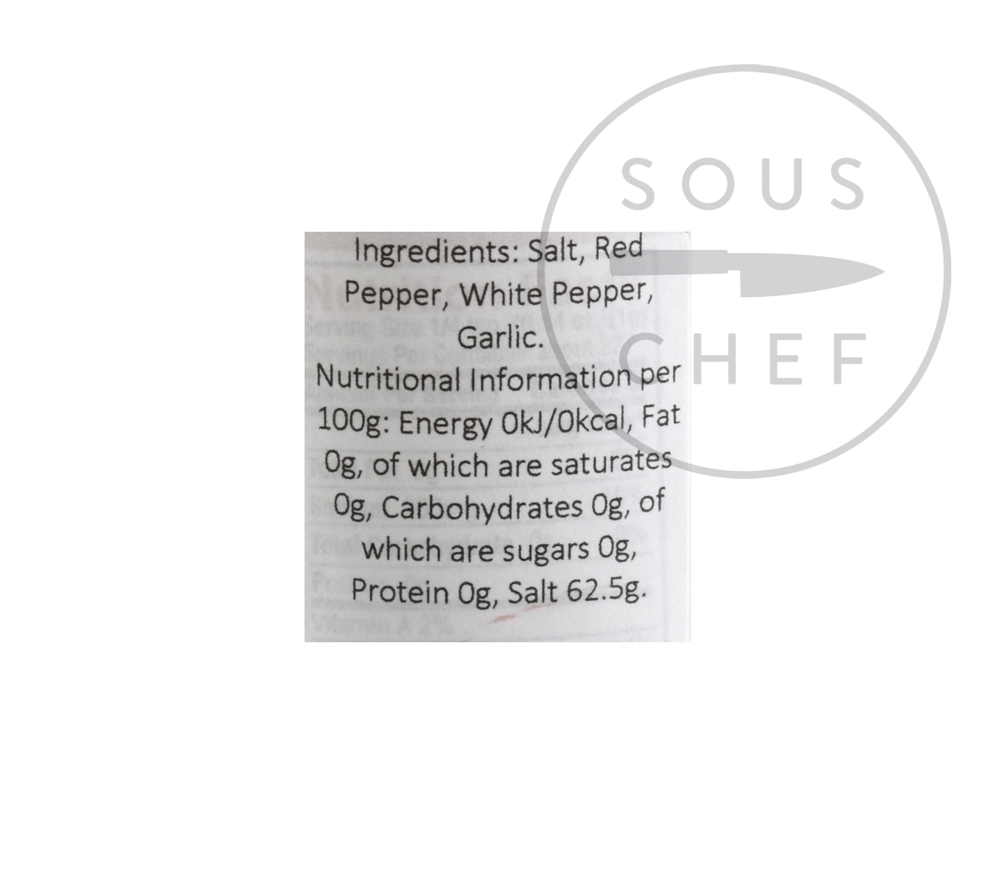Product formulations and details may change. For the latest ingredients and allergen information always check product packaging prior to consumption. Ingredients: Salt, red pepper, white pepper, garlic