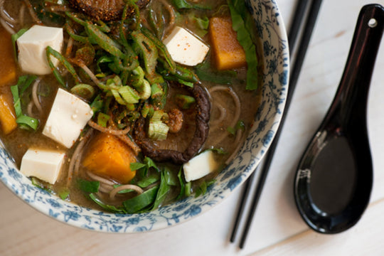 Enjoy soba noodles hot or cold with a tsuyu broth or dipping sauce. Soba noodles are made with buckwheat flour as well as wheat flour. The buckwheat flour has an intensely nutty flavour, so many Japanese soba dishes keep other flavours fresh and light. Soba noodles are popularly eaten on New Year’s Eve in Japan, in a dish called toshikoshi soba (New Year Soba). This is a warming soba noodle soup with dashi, mirin and soy sauce (though tsuyu soup base can be used for convenience), and is garnished with fresh spring onions and crispy flakes of tempura batter.