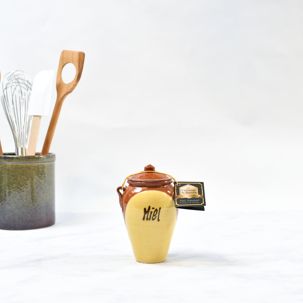 This Spanish wildflower honey comes from the untamed flowers, gorse and umbrella pines that make up the wild landscape of La Alcarria in central Spain. This light golden honey has slight floral notes, with a sweetness that works in both sweet and savoury dishes. The Spanish wildflower honey is presented in the traditional way, in a beautiful hand-painted terracotta jar. The wildflower honey is delicious spread on toast, spooned into porridge or drizzled over yoghurt and fresh fruit. Also use the honey as a glaze for meats or whisk into salad dressings.