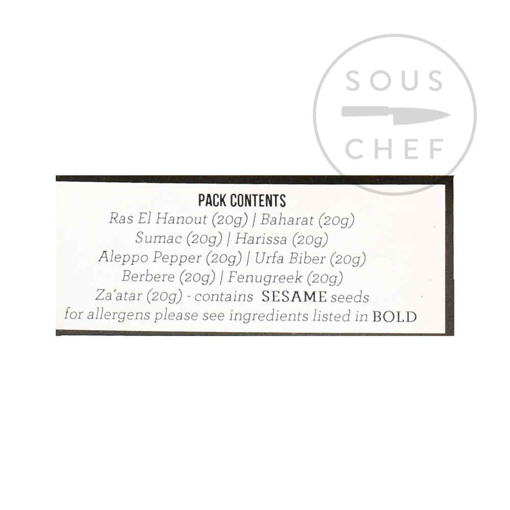 The Spice Kitchen African & Middle Eastern spice tin will send you on a culinary journey throughout Africa and the Middle East. This selection of essential spices and spice blends is presented in a stainless-steel spice tin, or masala dabba.