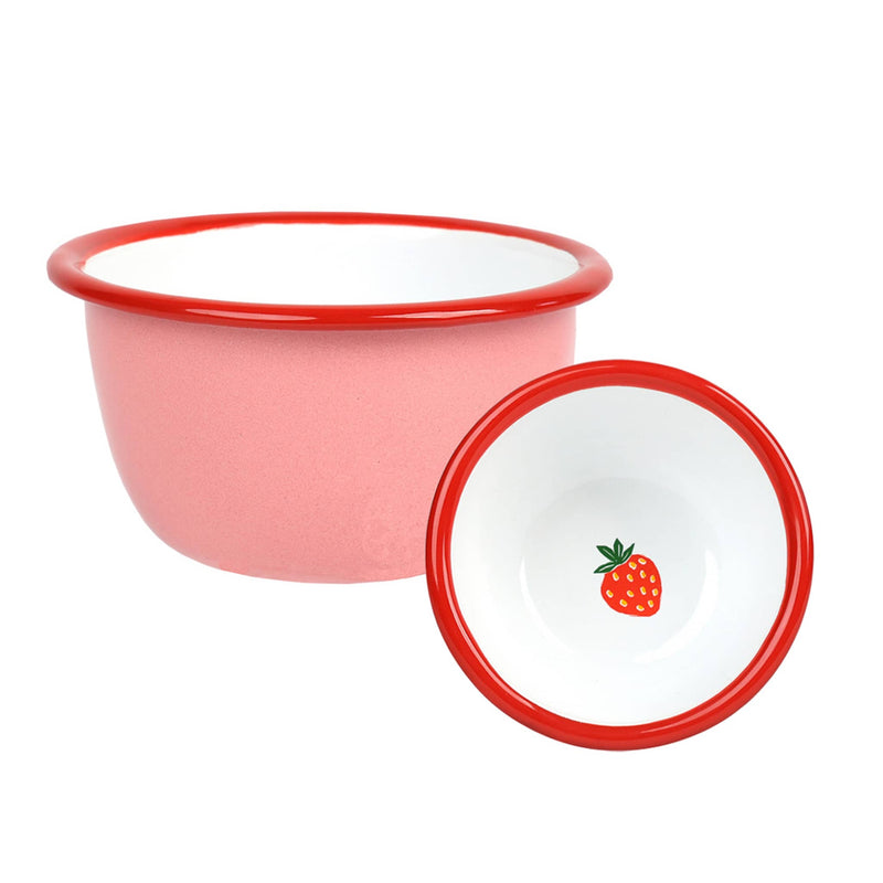 Fill this strawberry print enamel bowl with berries or salty snacks. It’s perfect for nuts, candy and chocolate. You can also use it for puddings like ice cream or strawberry mousse.