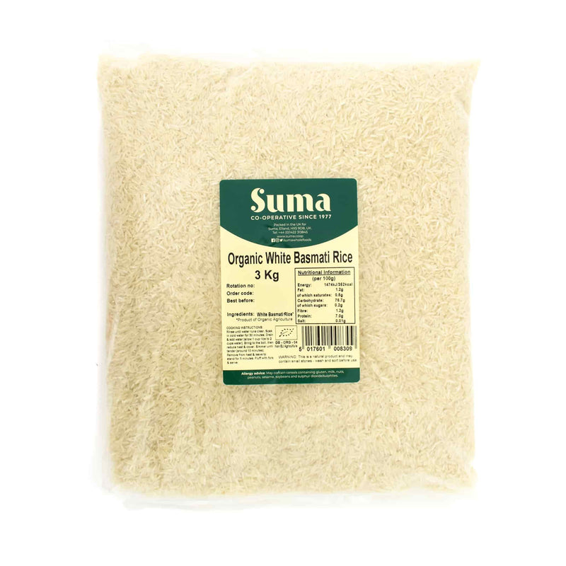 Suma’s Organic white basmati rice is fragrant long grain rice that is light, fluffy and mild in flavour. A culinary staple in India, it adds soft texture to dishes and serves to sooth against the bolder, spicier flavours of curries, stews and dals.