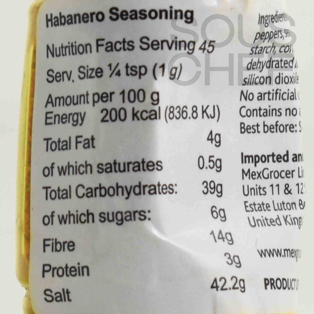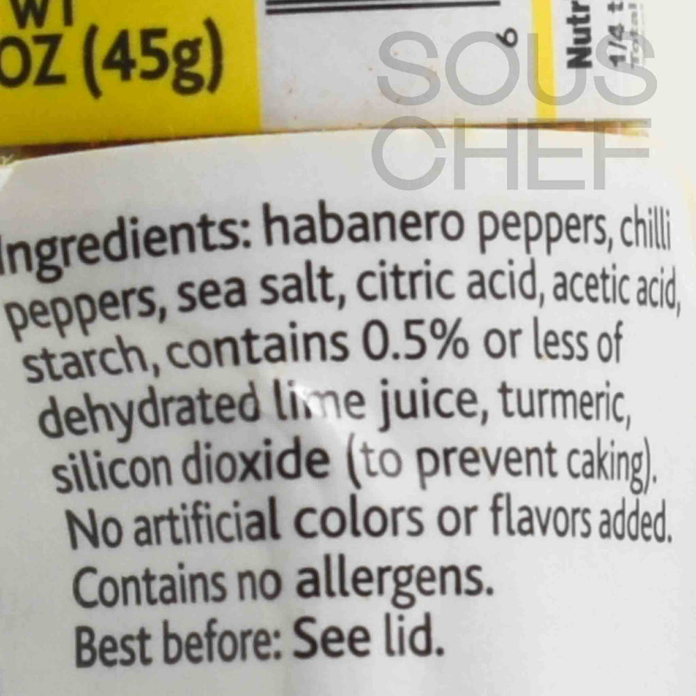 Product formulations and details may change. For the latest ingredients and allergen information always check product packaging prior to consumption. Ingredients: Habanero peppers, chili peppers, citric acid, acetic acid, starch, contains 0,5% or less of dehydrated lime juice, turmeric, silicon dioxide (to prevent caking)