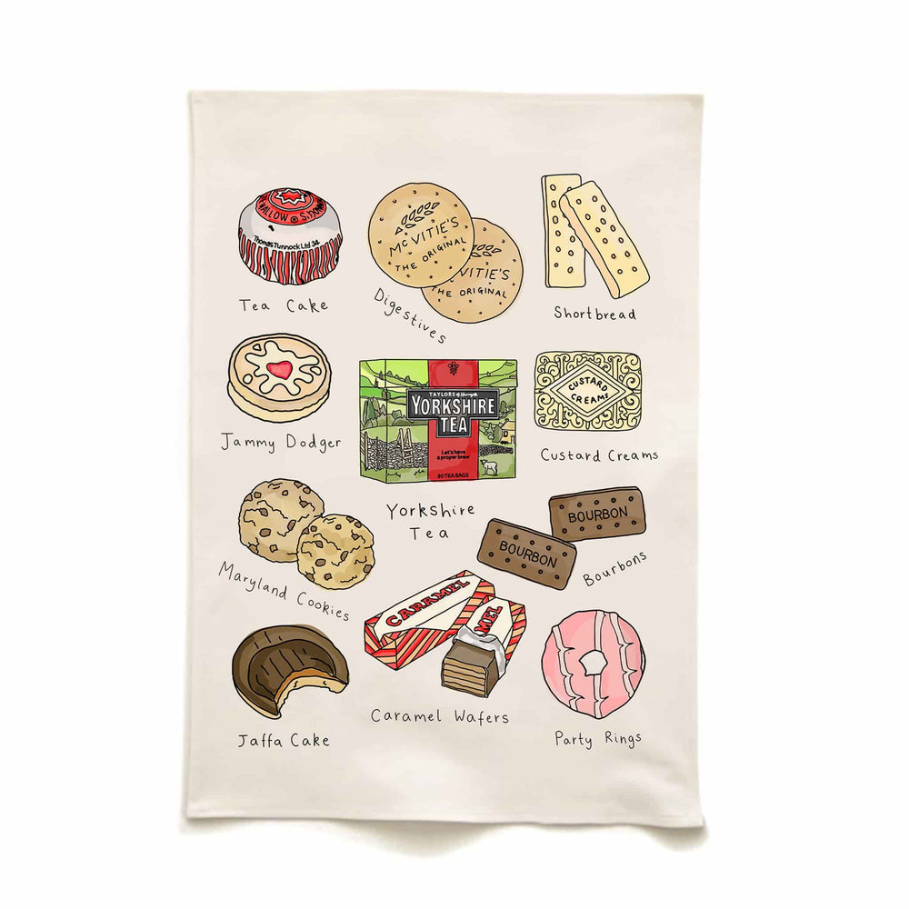 This tea towel has a charming tea and biscuits design. In the centre is a box of the UK's best-selling tea brand, Yorkshire Tea.
