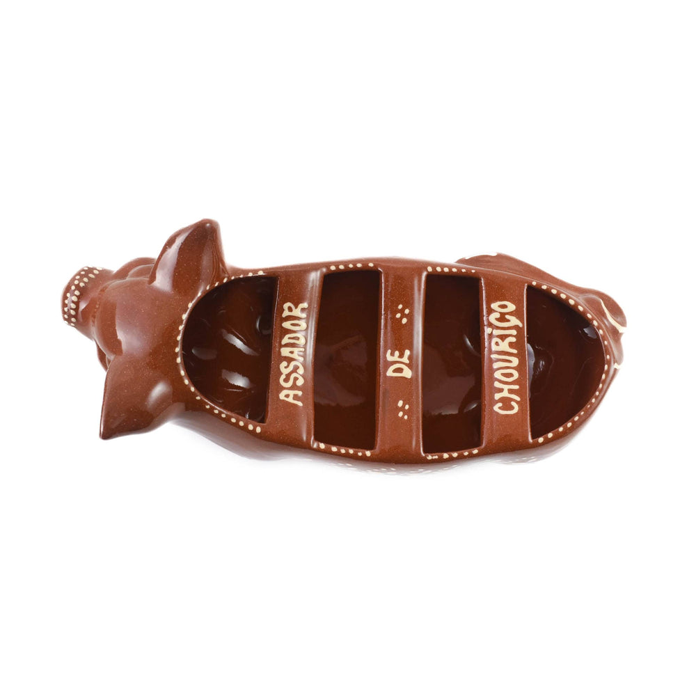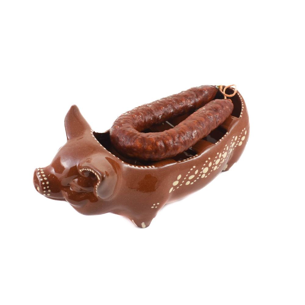Use this terracotta chorizo pig serving dish to flame spicy sausages at your dinner table. Handmade in Portugal, clay sausage roasters like this one are a familiar sight at barbecues, family gatherings and taverns known as tasquinhas. They are used to grill and flambé all kinds of sausages, from spiced chouriço and linguiça to rustic morcela (similar to black pudding). Shaped like a pig standing proudly to attention, the deep red dish has hand-painted details that give it a charming, rustic look.