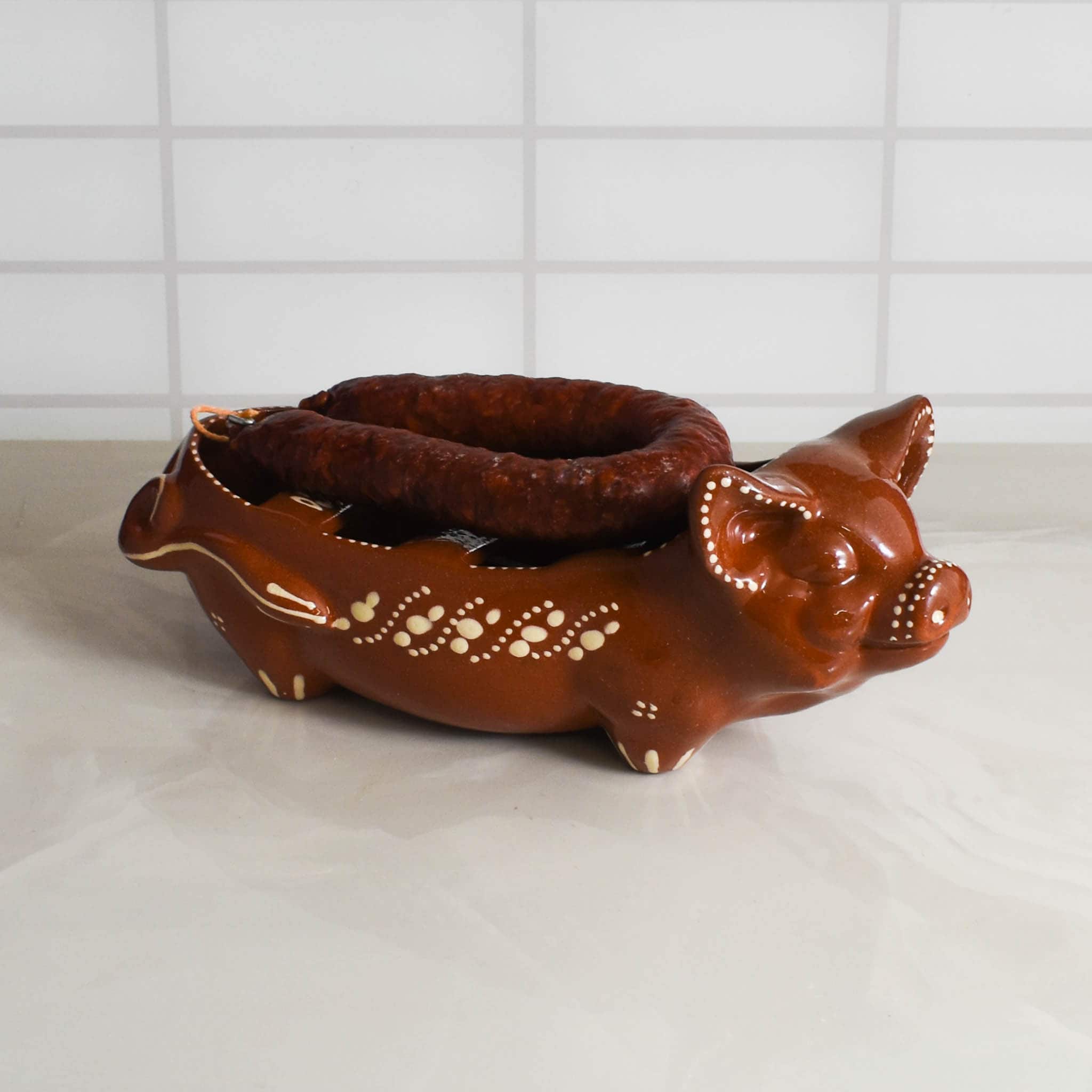 The chorizo pig serving dish is handmade by a small family-owned pottery business using natural red clay. It can be used in your oven, on gas stove tops and in wood-burning ovens and grills. It is not suitable for glass or induction hobs.