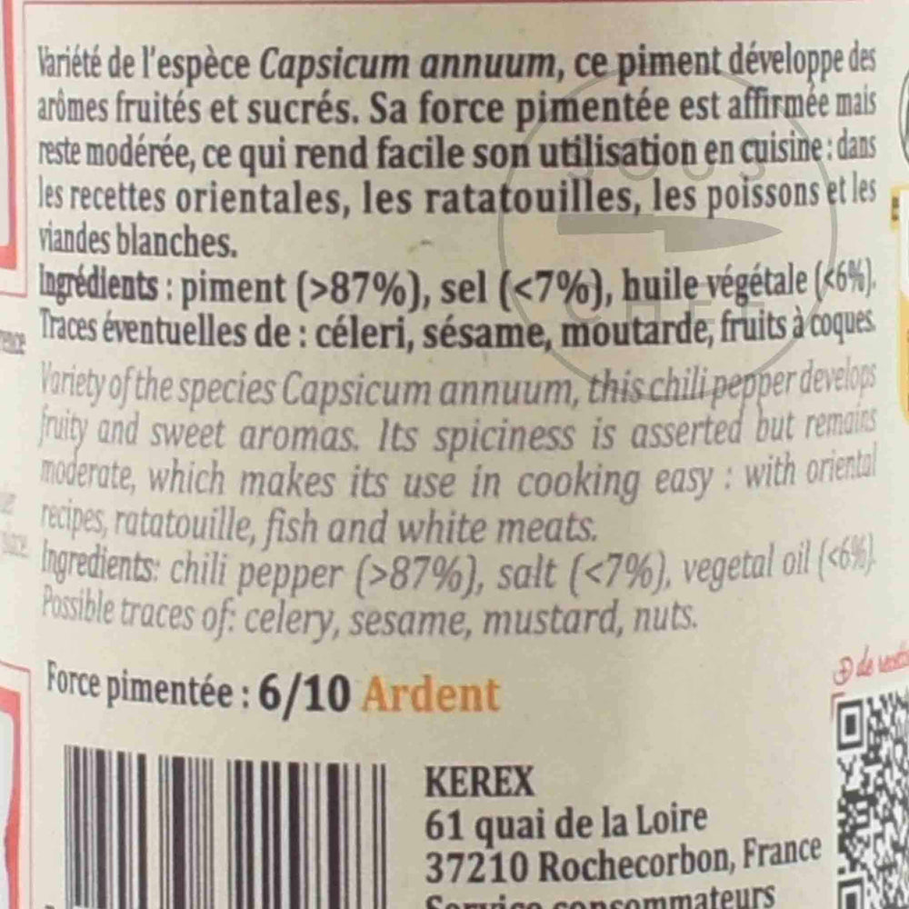 Product formulations and details may change. For the latest ingredients and allergen information always check product packaging prior to consumption. Ingredients: Chili pepper (>87%), salt (<7%), vegetal oil (<6%).