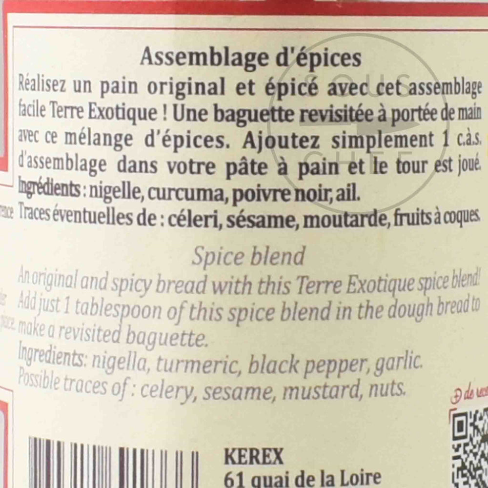 Terre Exotique’s baker spice blend has an earthy aroma and warm, spicy flavour. Made with turmeric, nigella seeds, garlic and black pepper, it will transform homemade bread and pastries. Add it to your baguette dough to make a classic French stick with a hint of spice.
