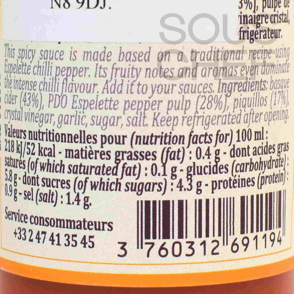 Product formulations and details may change. For the latest ingredients and allergen information always check product packaging prior to consumption. Ingredients: Basque cider (43%), pdo spelette pepper pulp (28%), piquillos (17%), crystal vinegar, garlic, sugar, salt.