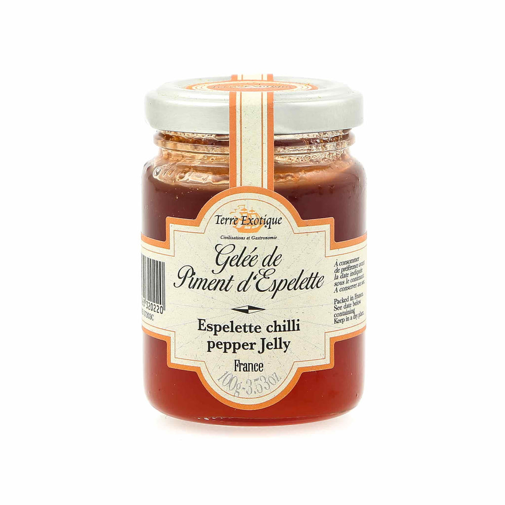Terre Exotique’s espelette pepper jelly is a spicy condiment to serve with nutty hard cheeses. Espelette pepper is a mild French chilli with smoky, citrusy flavours. Here, the chilli is paired with pectin and sugar to produce a beautifully set jelly.