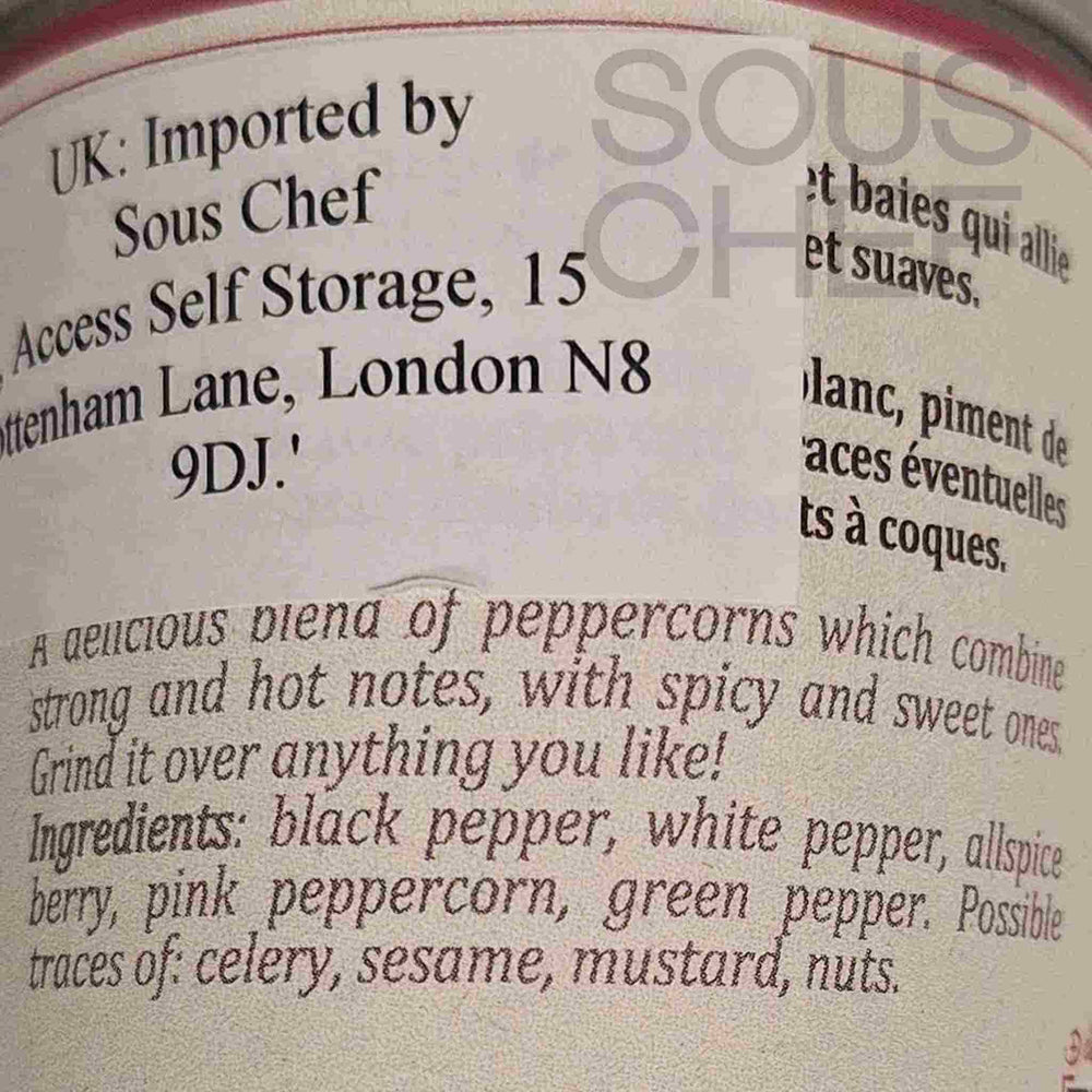 Product formulations and details may change. For the latest ingredients and allergen information always check product packaging prior to consumption. Ingredients: Black pepper, white pepper, allspice berry, pink peppercorn, green pepper