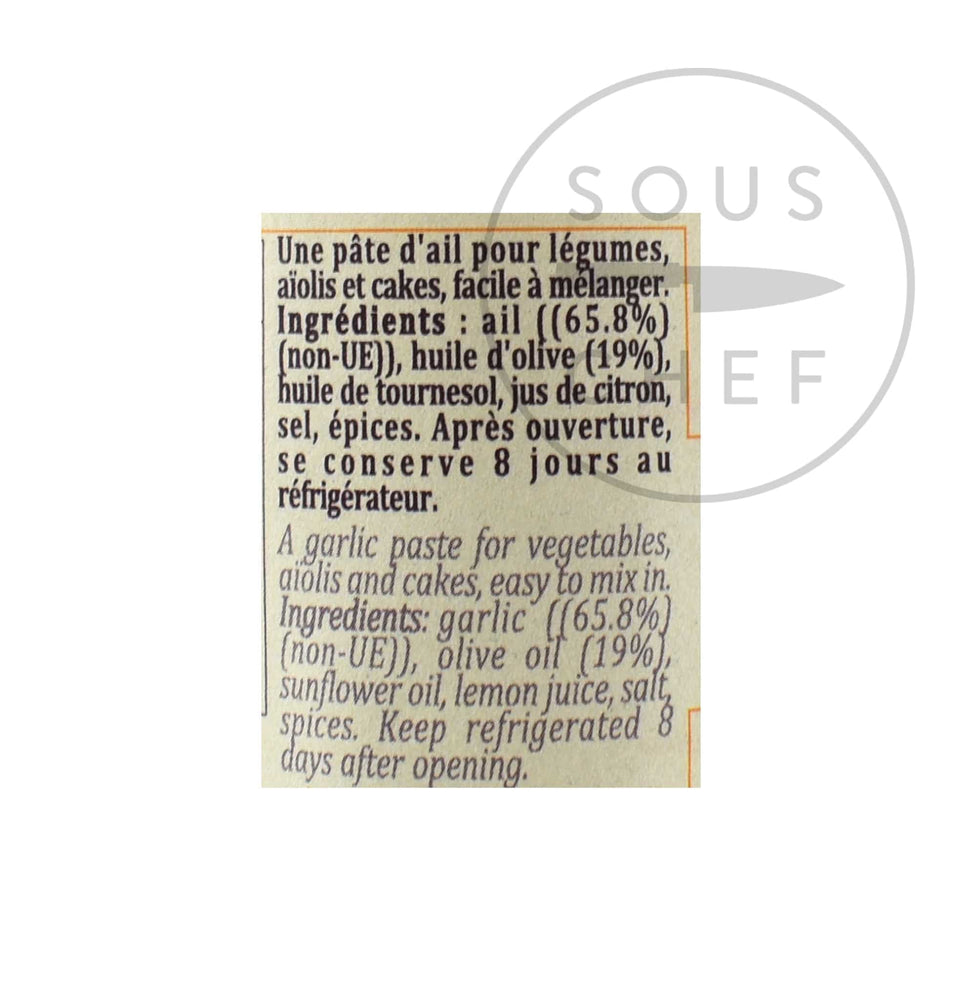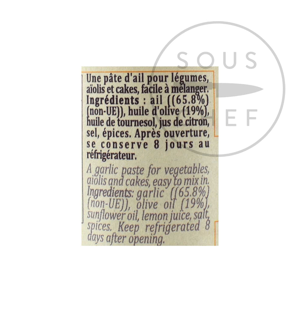Terre Exotique’s garlic paste is a must-have in every French kitchen! Made by blending garlic with artichoke, sunflower oil and salt, this ready-made paste is pungent with a strong garlic aroma and flavour.