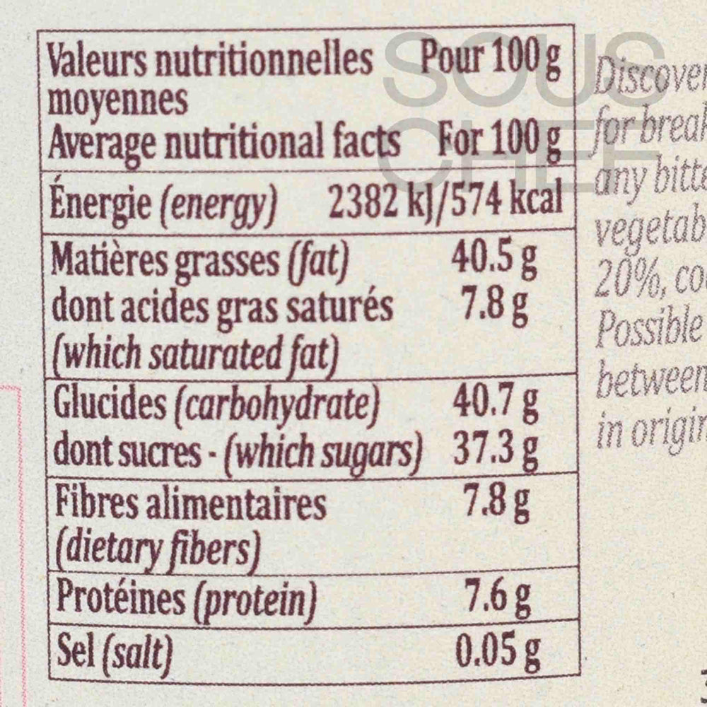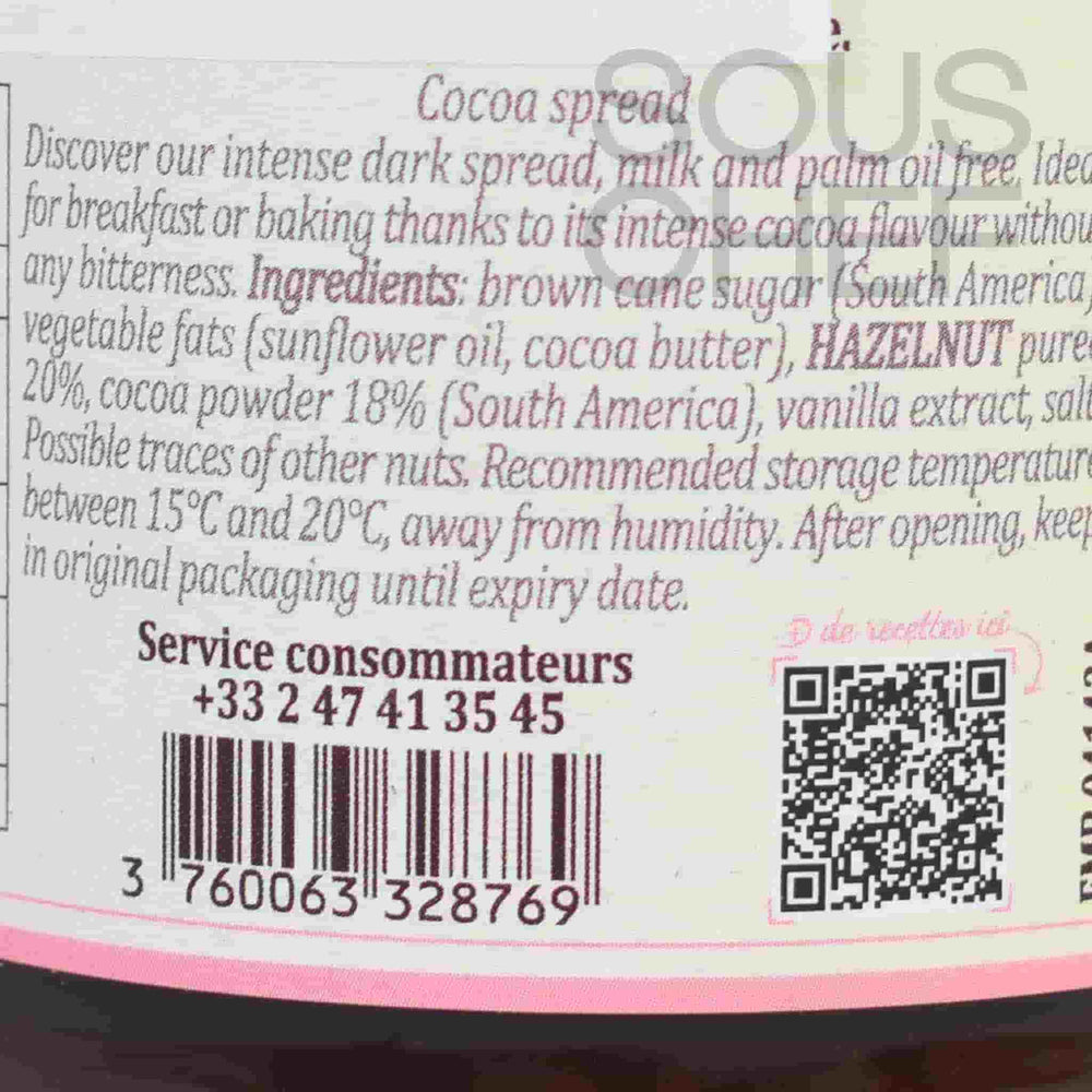 Product formulations and details may change. For the latest ingredients and allergen information always check product packaging prior to consumption. Ingredients: Brown cane sugar, vegetable fats (sunflower oil, cocoa butter), hazelnut puree 20%, cocoa powder 18%, vanilla extract, salt.