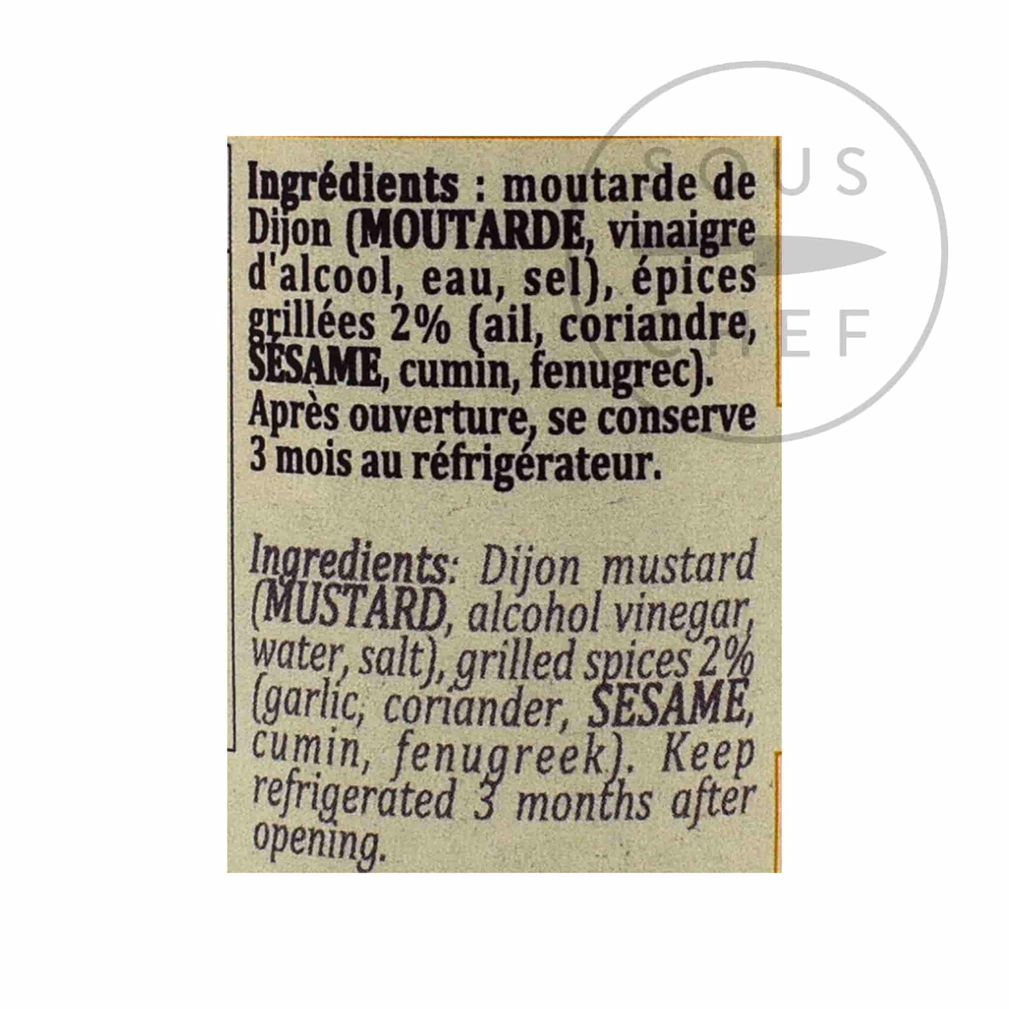 Product formulations and details may change. For the latest ingredients and allergen information always check product packaging prior to consumption. Ingredients: Dijon mustard (mustard, alcohol vinegar, water, salt), grilled spices 2% (garlic, coriander, sesame, cumin, fenugreek).