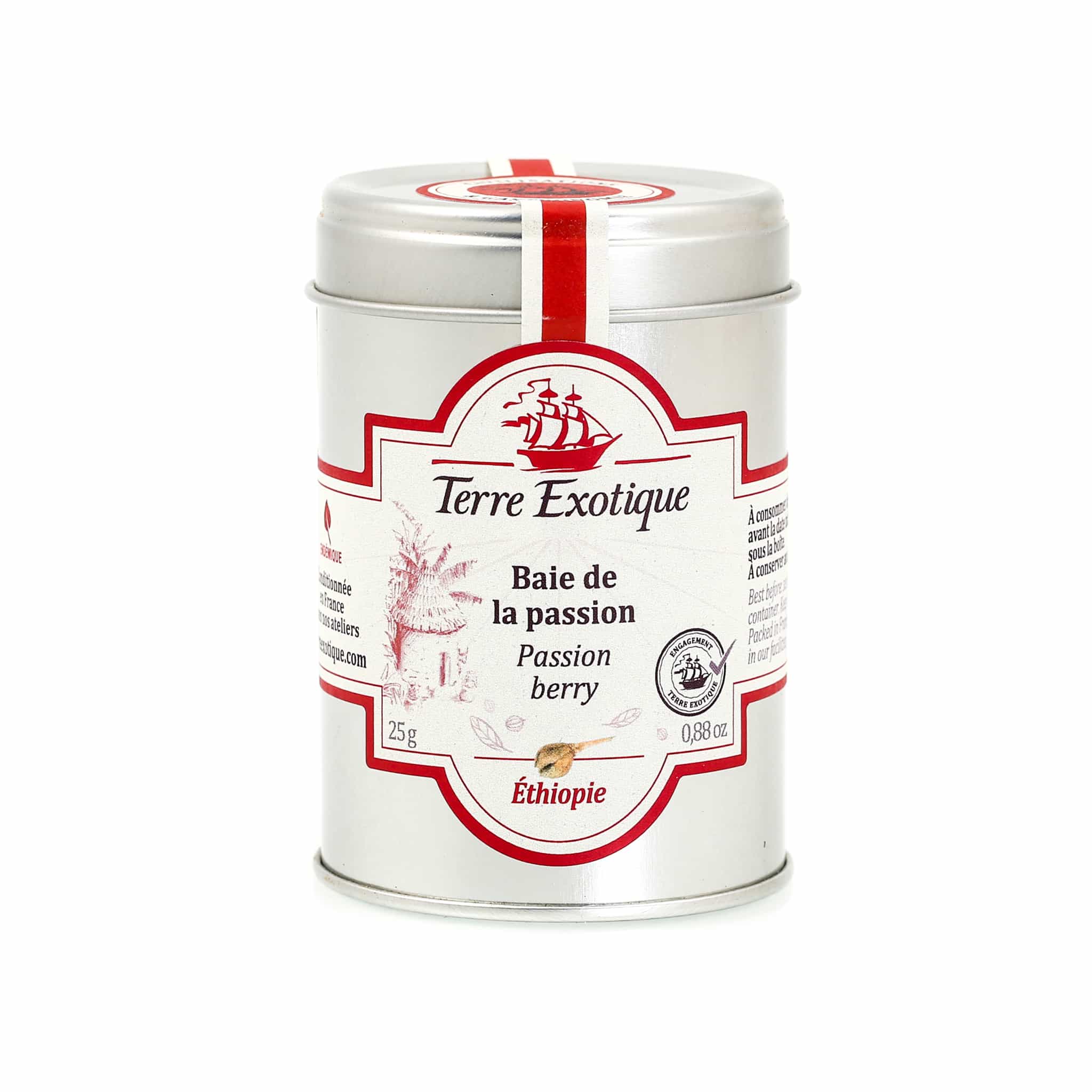 Terre Exotique’s passion berry is a pepper with intense passion fruit aromas and flavours, with a tingling cold-spiciness. Crush in a pestle and mortar, then sprinkle over pan-fried sea bass, grilled vegetables or freshly sliced fruit.