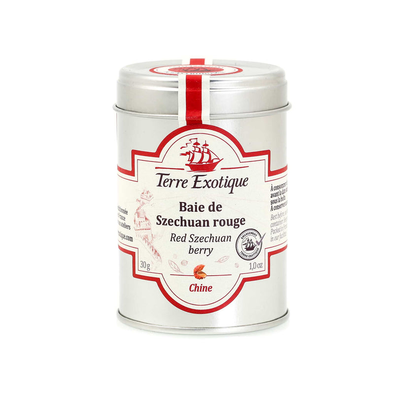 Terre Exotique’s red Szechuan berry is citrusy and spicy - a versatile pepper that pairs well with white fish, grilled asparagus and chocolate tortes. Taking its name from the region it grows, Szechuan, these small berries start green, turn red, then brown when fully ripened. The berries are dried, the two black seeds removed, leaving the outer red husk to be used in cooking.