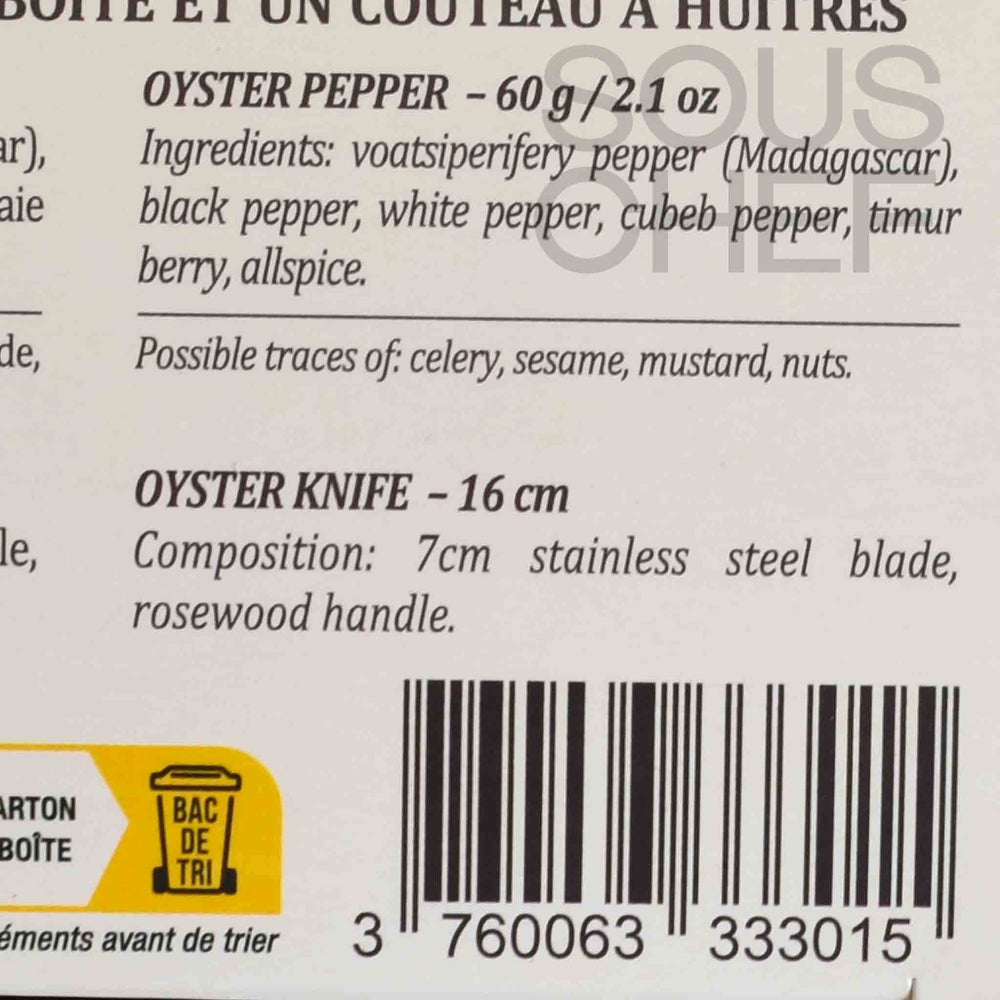 Product formulations and details may change. For the latest ingredients and allergen information always check product packaging prior to consumption. Ingredients: Oyster pepper(voatsiperifery pepper (madagascar), black pepper, white pepper, cubeb pepper, timur berry, allspice.