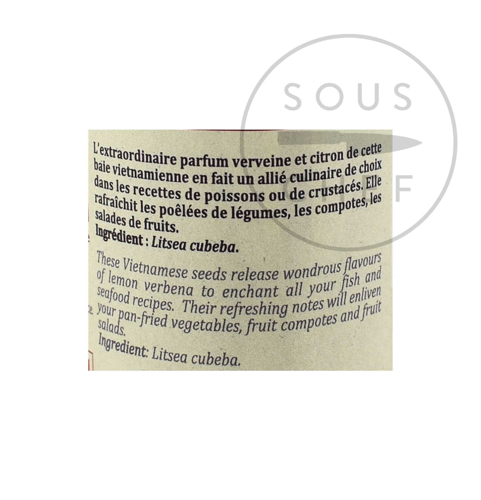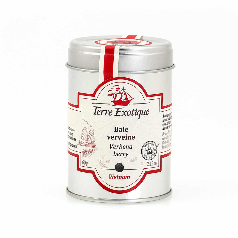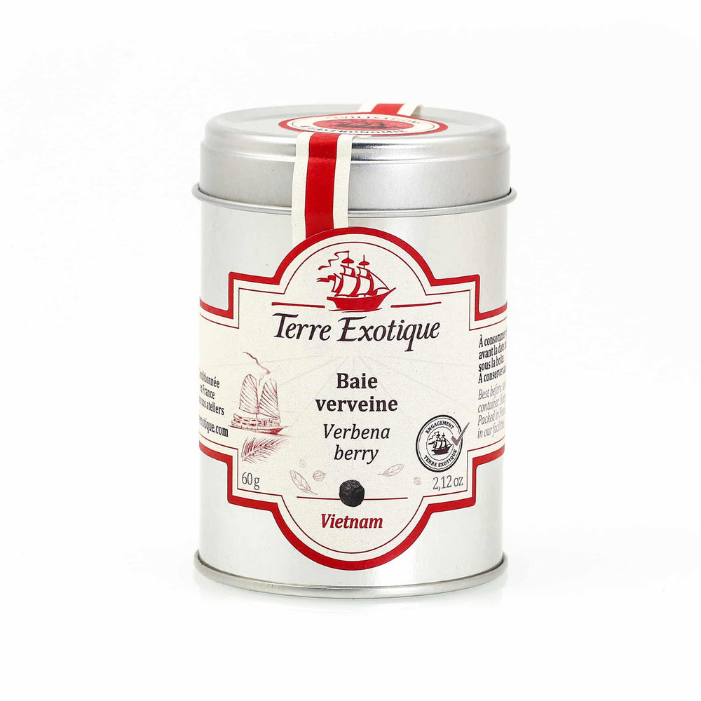 Terre Exotique’s verbena berry is a Vietnamese seed with a heady, floral flavour. Use them to add aroma and lemon flavour to fish and seafood dishes. Or sprinkle it into stir-fried vegetables. They also work well in sweet recipes, such as fruit compotes and even to flavour thick custards.