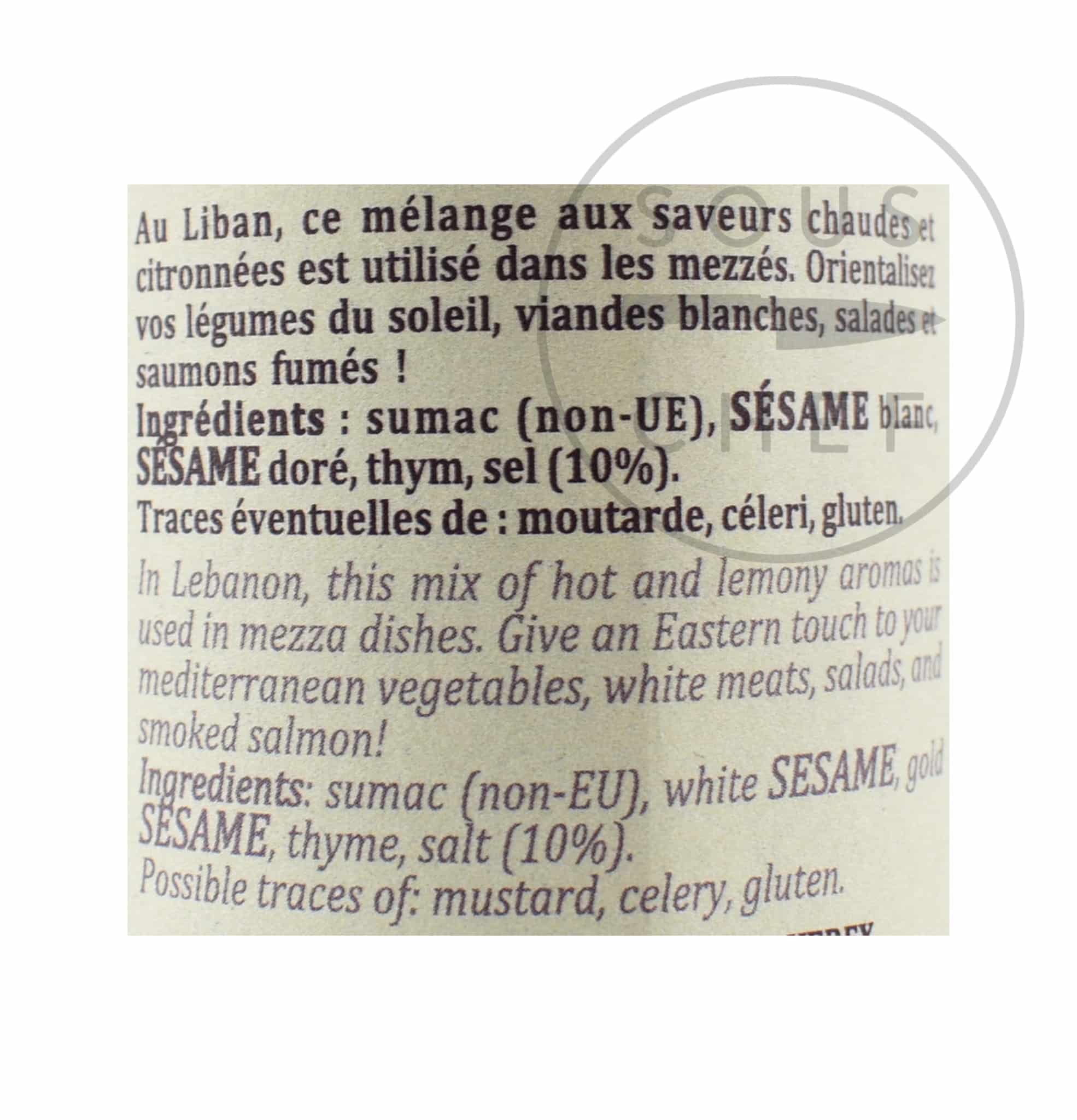 Product formulations and details may change. For the latest ingredients and allergen information always check product packaging prior to consumption. Ingredients: sumac (non EU), white sesame, gold sesame, thyme, salt (10%).