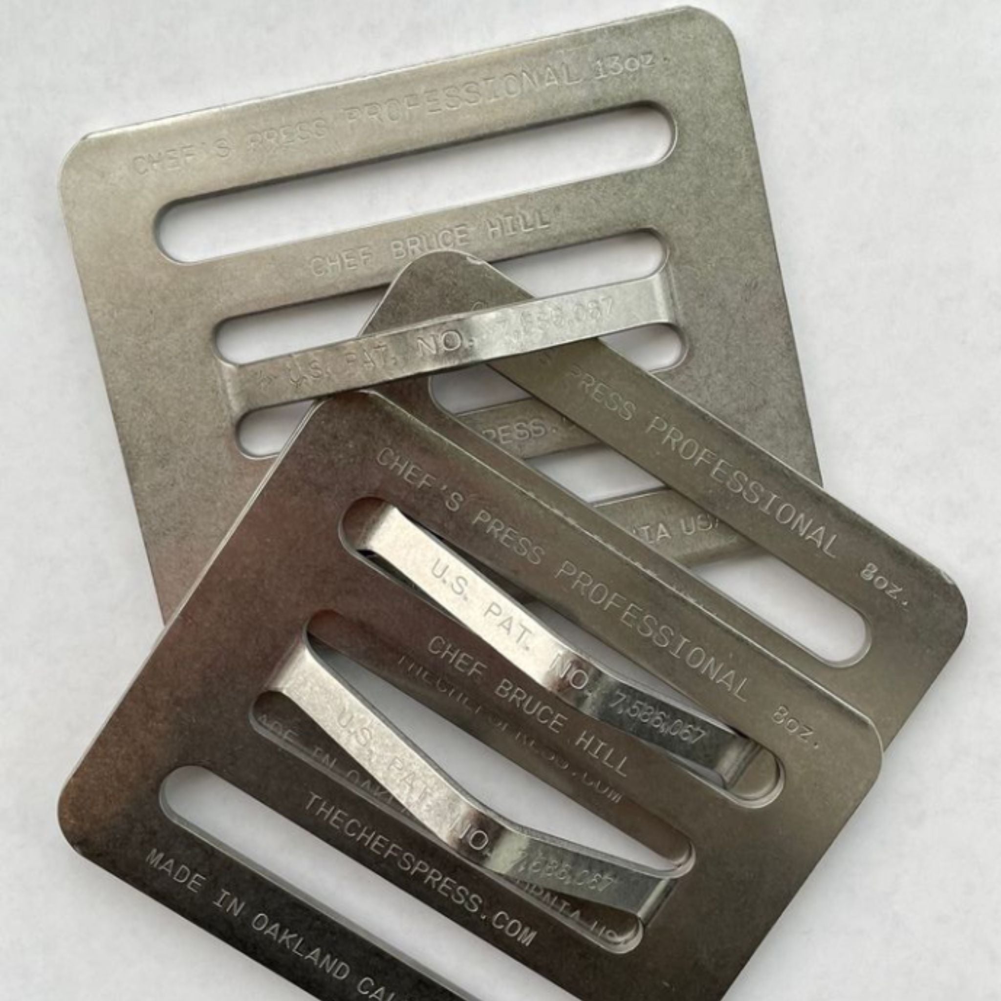 The Chef’s Press was created by Chef Bruce Hill while he was working in a tiny kitchen of Bix Restaurant in San Francisco. The traditional cast iron weights were too heavy for many dishes and also trapped steam.