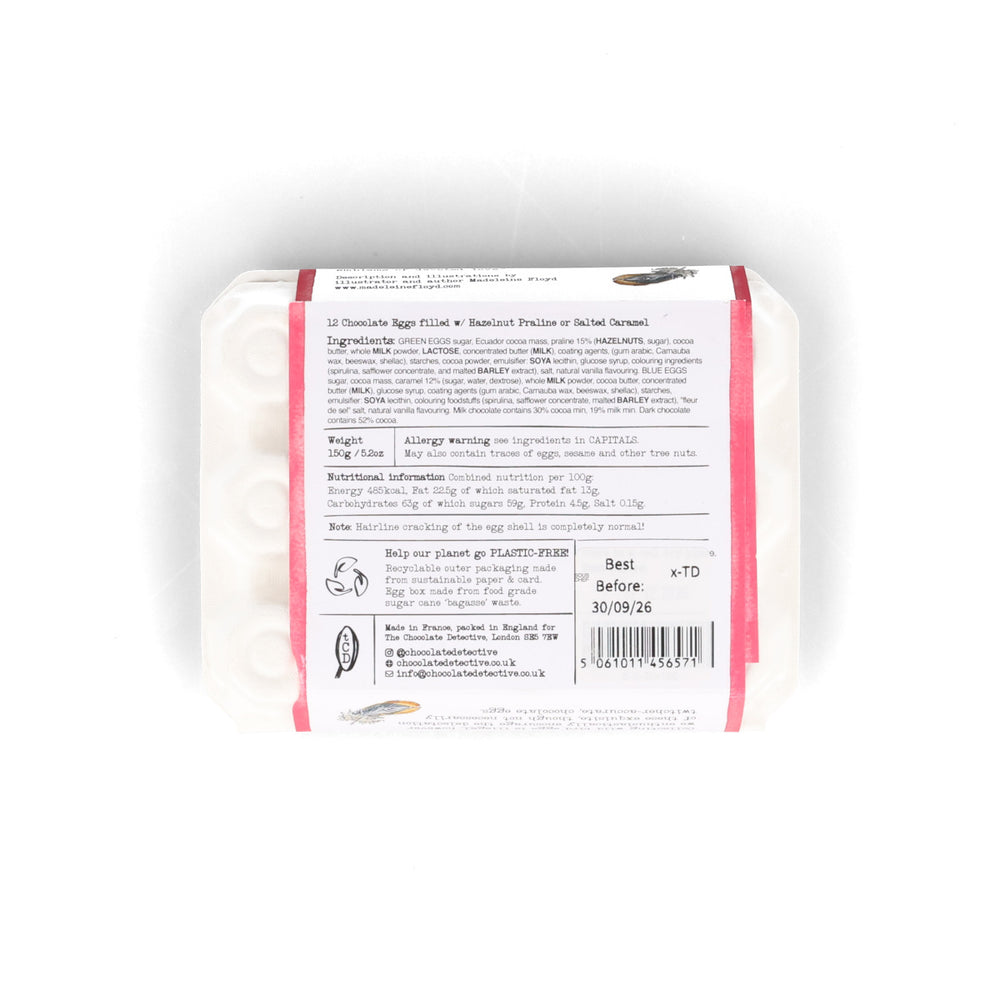 Product formulations and details may change. For the latest ingredients and allergen information always check product packaging prior to consumption. Ingredients: Hazelnut praline egg: sugar, ecuador cocoa mass, praline 15% (hazelnuts, sugar), cocoa butter, whole milk powder, lactose, concentrated butter (milk), coating agents (gum arabic, carnauba wax, beeswax, shellac), starches, cocoa powder, emulsifier: soya lecithin, glucose syrup, colouring ingredients (spirulina, safflower concentrate, and malted barley extract), salt, natural vanilla flavouring. salted caramel egg: sugar, cocoa mass, caramel 12% (sugar, water dextrose), whole milk powder, cocoa butter, concentrated butter (milk), glucose syrup, coating agents (gum arabic, carnauba wax, beeswax, shellac), starches, emulsifier: soya lecithin, colouring foodstuffs (spirulina, safflower concentrate, malted barley extract), “fleur de sel” salt, natural vanilla flavouring. milk chocolate contains 30% cocoa min, 19% milk min. dark chocolate contains 52% cocoa.