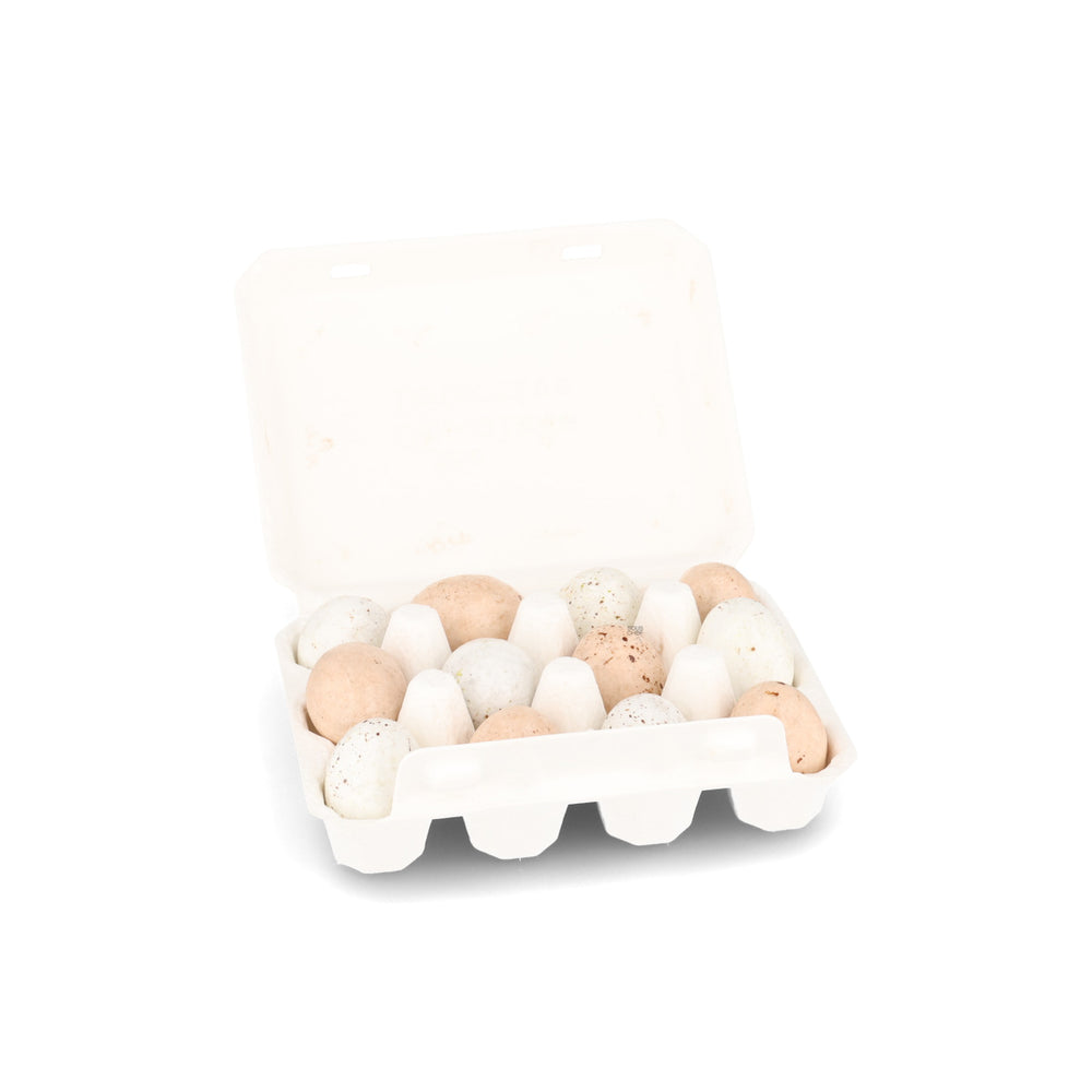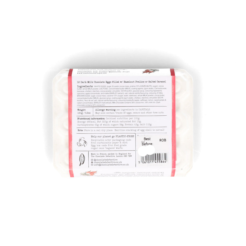 Six eggs are filled with smooth salted caramel. The rest are filled with a rich hazelnut praline.