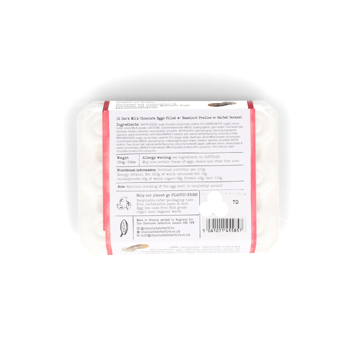 Six eggs are filled with smooth salted caramel. The rest are filled with a rich hazelnut praline.