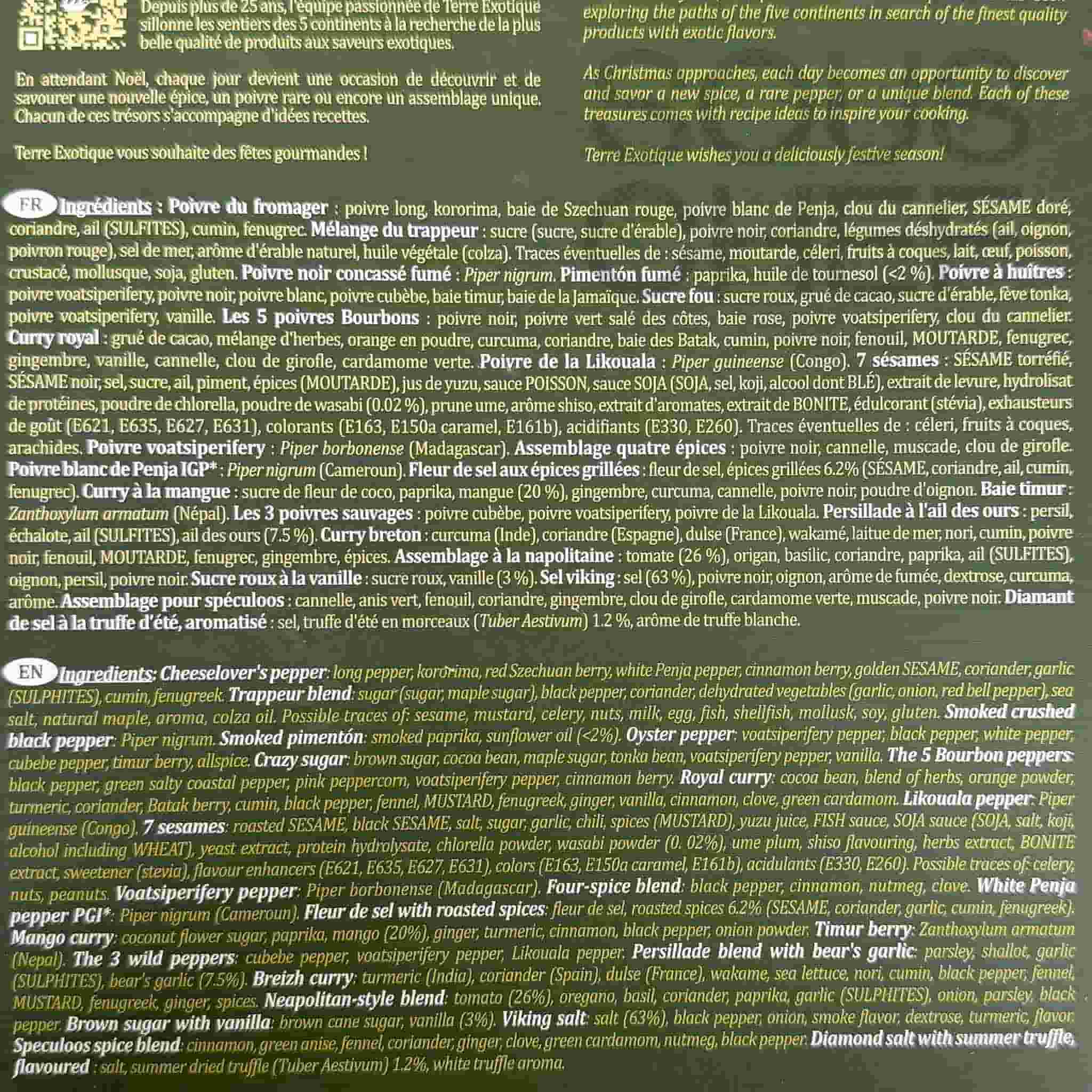 Product formulations and details may change. For the latest ingredients and allergen information always check product packaging prior to consumption. Ingredients: cheeselover's pepper (sesame, sulphites), trappeur blend, smoked crushed black pepper, smoked pimentón, oyster pepper, crazy sugar, The 5 Bourbon peppers, royal curry (mustard), Likouola Pepper, 7 sesames (sesame, soy, mustard, gluten, fish) voatsiperifery pepper, four spice blend, white Penja pepper PGI, fleur de sel with roasted spices (sesame), mango curry, timur berry, The 3 wild peppers, persillade blend with bear's garlic (sulphites), Breizh curry (mustard), Neapolitan-style blend (sulphites), brown sugar with vanilla, viking salt, speculoos spice blend, diamond salt with summer truffle.