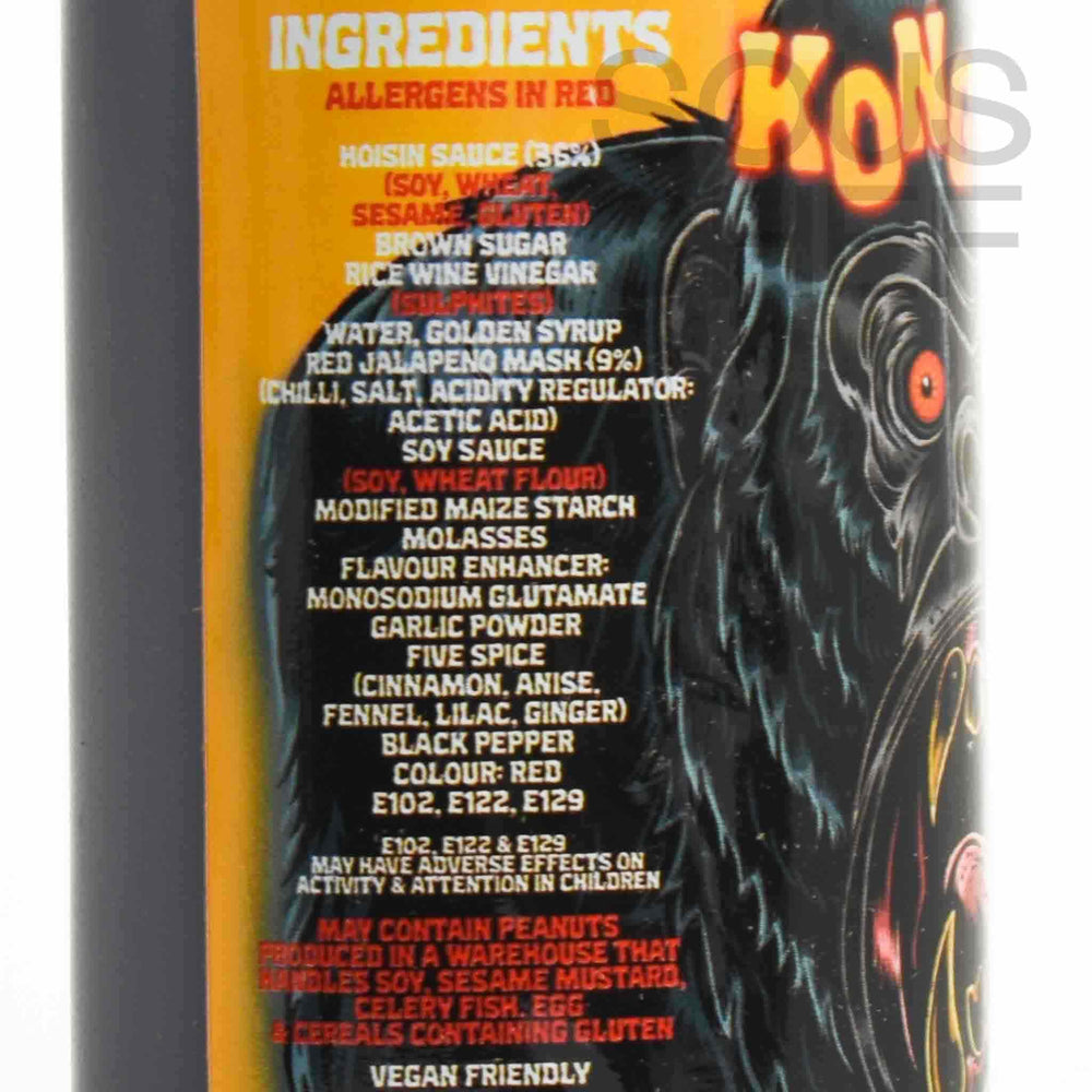 Product formulations and details may change. For the latest ingredients and allergen information always check product packaging prior to consumption. Ingredients: Rice wine vinegar (sulphites), soy sauce (soy), hoisin sauce (soy, wheat, sesame, gluten), golden syrup, molasses, water, brown sugar, msg, 5 spice, ginger powder, black pepper, garlic powder, ginger powder, red jalapeno mash, colour (e102, e122, e129)